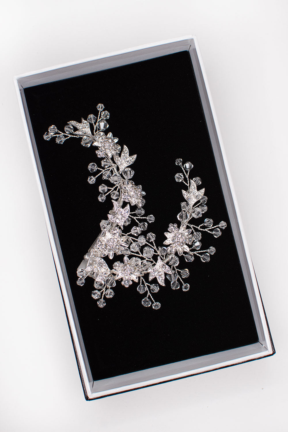 A dainty crystallised side comb, Alisha elegantly dresses the hair with an abundance of clear stones and encrusted metal leaves. Fitted with a strong clip on the back, Alisha can be comfortably worn as a side comb or to be a short vine on the back of the head.