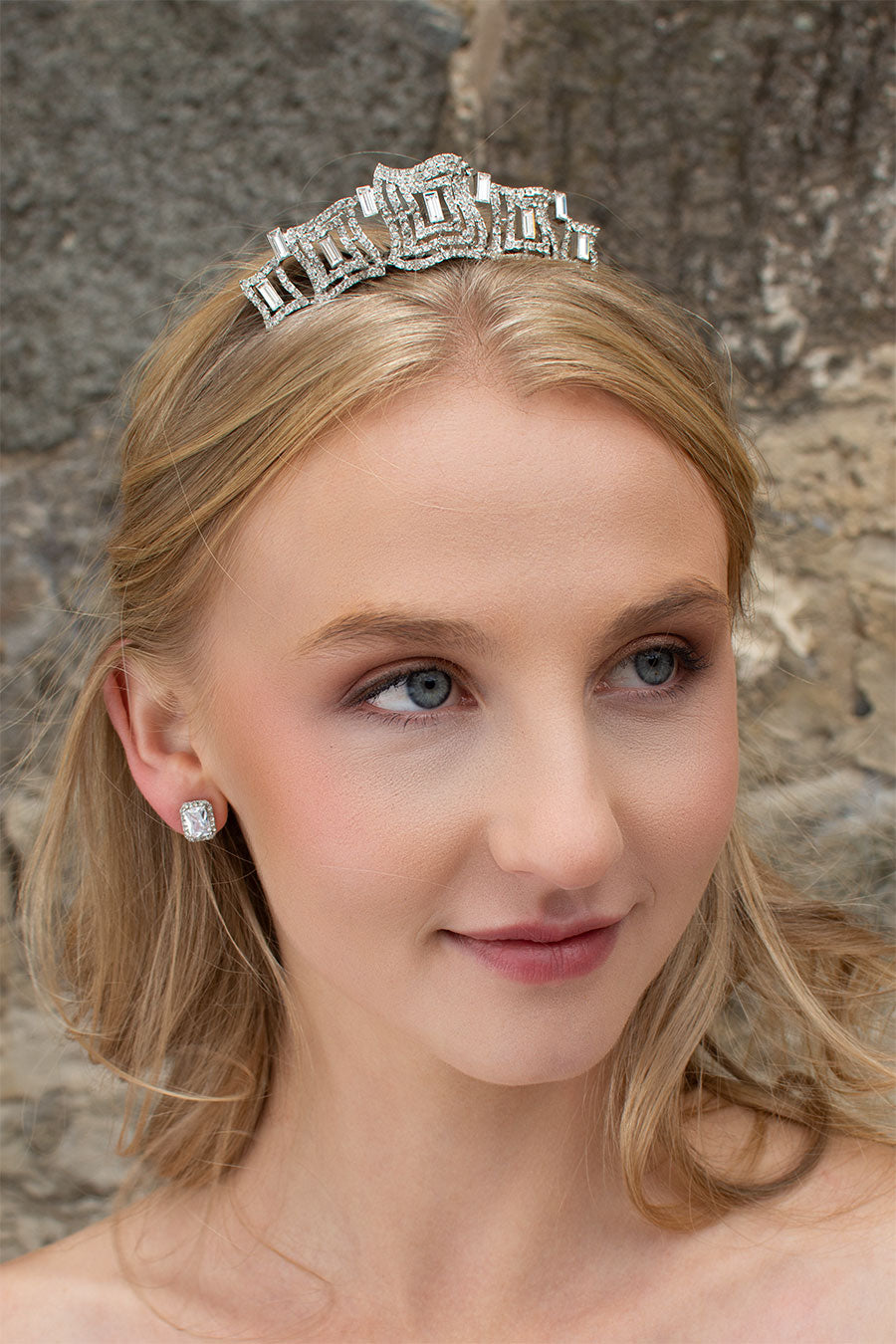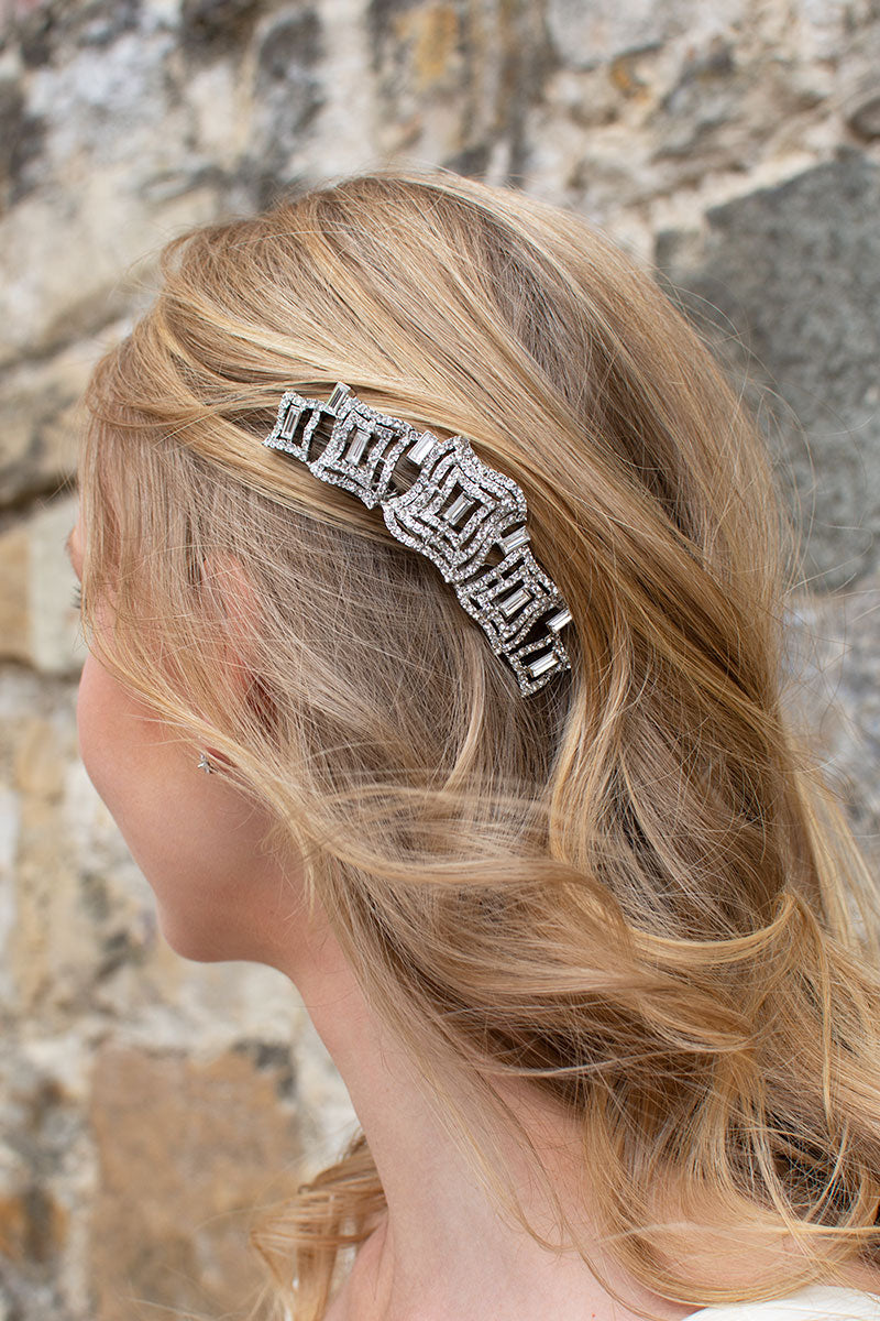 Our Boucheron side comb is a modern take on French art-deco jewellery set in rhodium (dark silver). Encrusted in tiny crystals, the versatile Boucheron design can be a traditional tiara or a side comb. So, if you are looking for a uniquely timeless bridal piece, Boucheron is the one for you.
