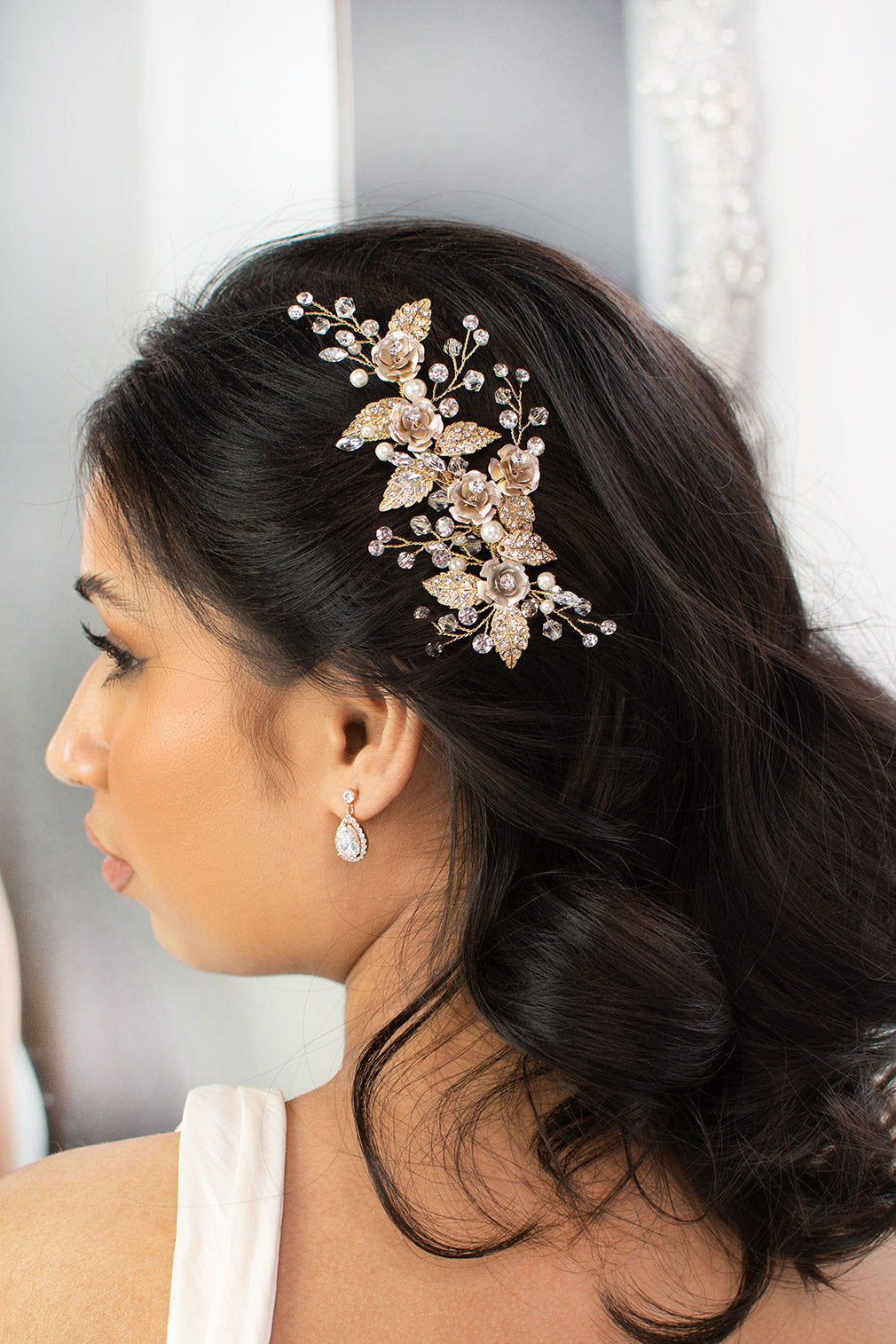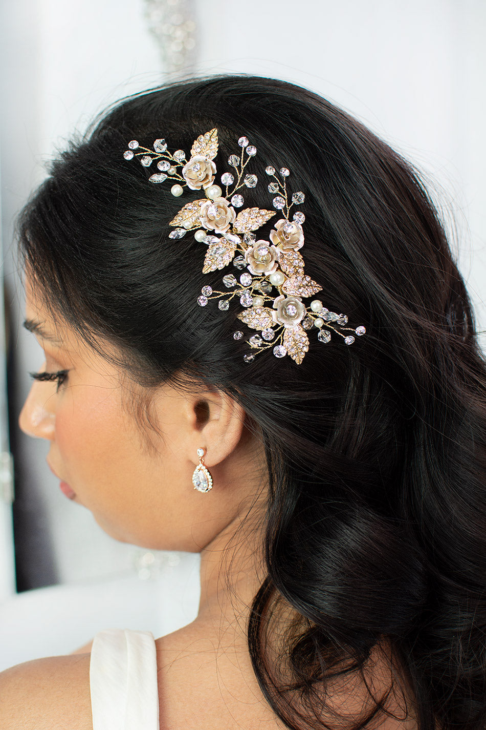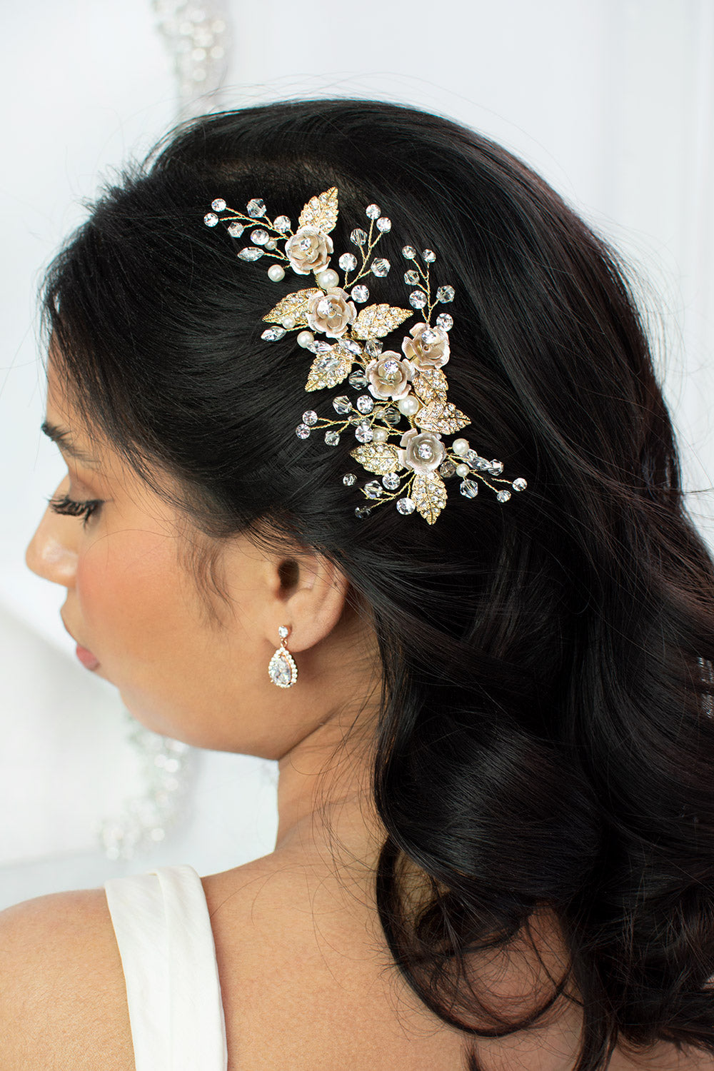 Clarissa is a soft gold dainty floral masterpiece full of small metal roses and leaves encrusted in tiny gleaming clear stones. The delicate clear bead and pearl sprigs create a beautiful floral effect that will endow your bridal look with classic elegance. Clarissa is complete with a strong clip fitting for an easy and comfortable wear.