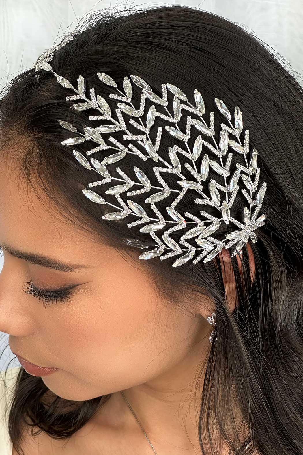 Are you looking for a statement headpiece to make all of your wedding party love how you look? Delphine is the most lovely twin style headband that embraces you at both sides. In bright silver with beautiful crystal springs the shape is just divine. The frame easily shapes to fit your head and every part of this very well made piece can be adjusted to perfectly fit. Covered with long navette shape crystals Delphine will make you the most elegant and stunning Bride.
