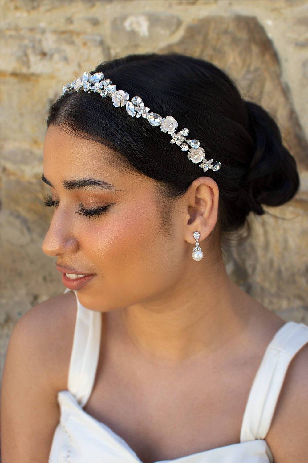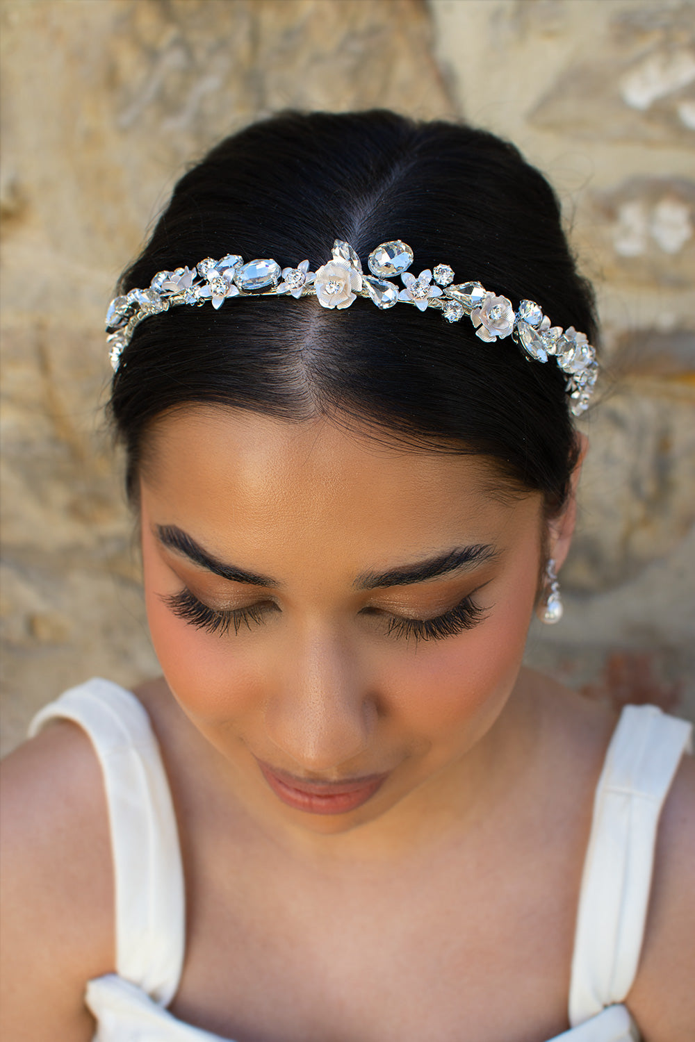 Greta is the essence of simple sophistication. This piece is the final fairy-tale touch to complete your bridal look if you have been looking for a narrow bridal headband style. It features a unique ensemble of Swarovski stones and embellished silver floral details. Greta is so easy to adjust for individual wearing preference and comfort that you won’t want to take this tiara off at the end of the day.