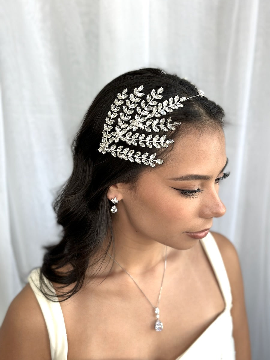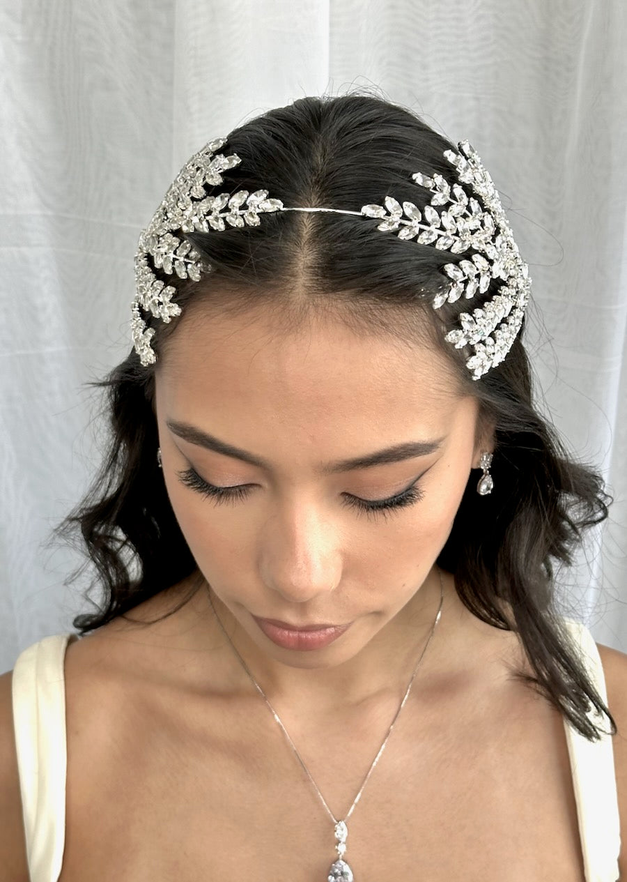 Make an entrance with a stunning modern bridal headpiece. Stop the show as you walk down the aisle in the most lovely twin style headband that embraces you at both sides. Manon in bright silver with beautiful crystal is just divine. The frame easily shapes to fit your head and every part of this very well made piece can be adjusted to perfectly fit. Covered with long navette shape crystals Manon will make you the most elegant and stunning Bride.