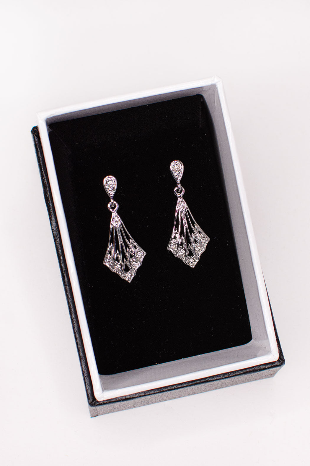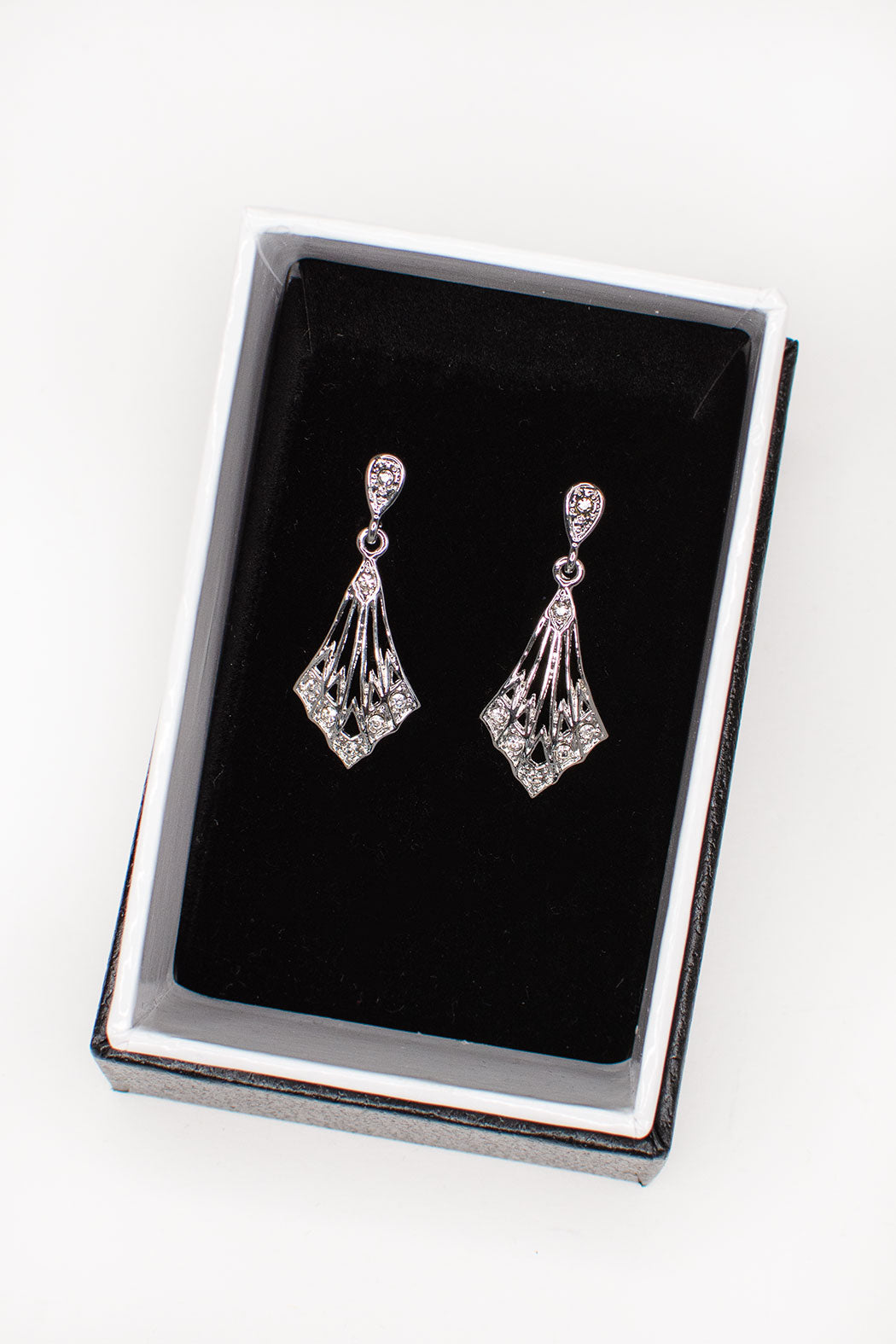 Marina is an unusual vintage design earring from the Art Deco period. In Rhodium(darker silver) finish this V shape drop earring has crystal accents. For the bride who wants that classic style.