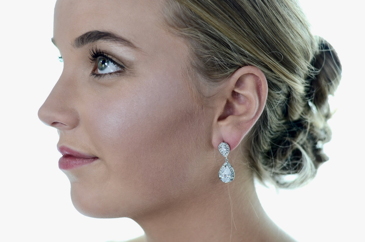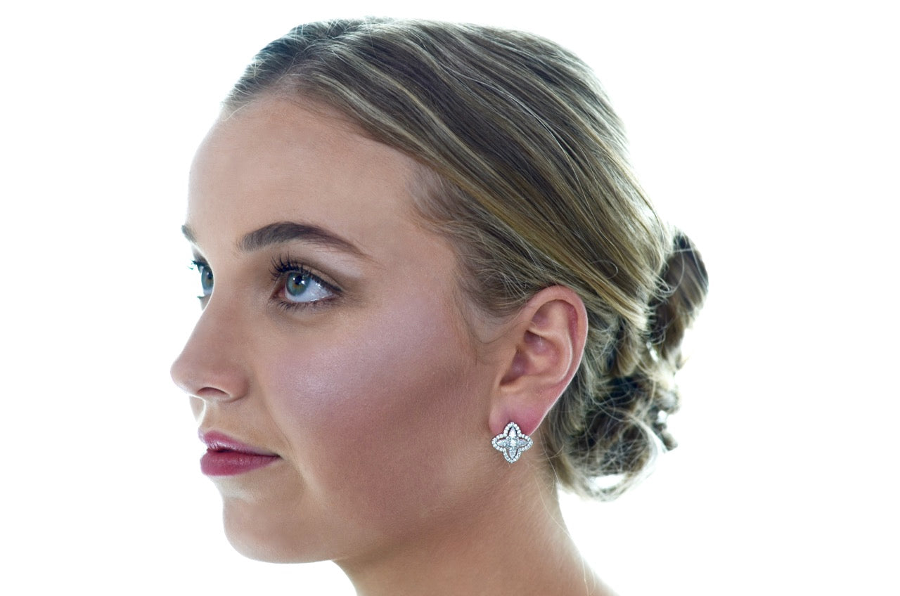 A classic bride needs a lovely pair of earrings to complete her elegant look on the biggest day of her life. The Sarah earrings are a superb stud earring with delicate beautiful stones forming a cross shape. Finished in rhodium (darker silver) the stones glisten and glimmer with quality. In an antique style the Sarah earrings can give that finishing touch to make a lovely bride timelessly elegant.
