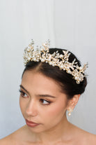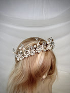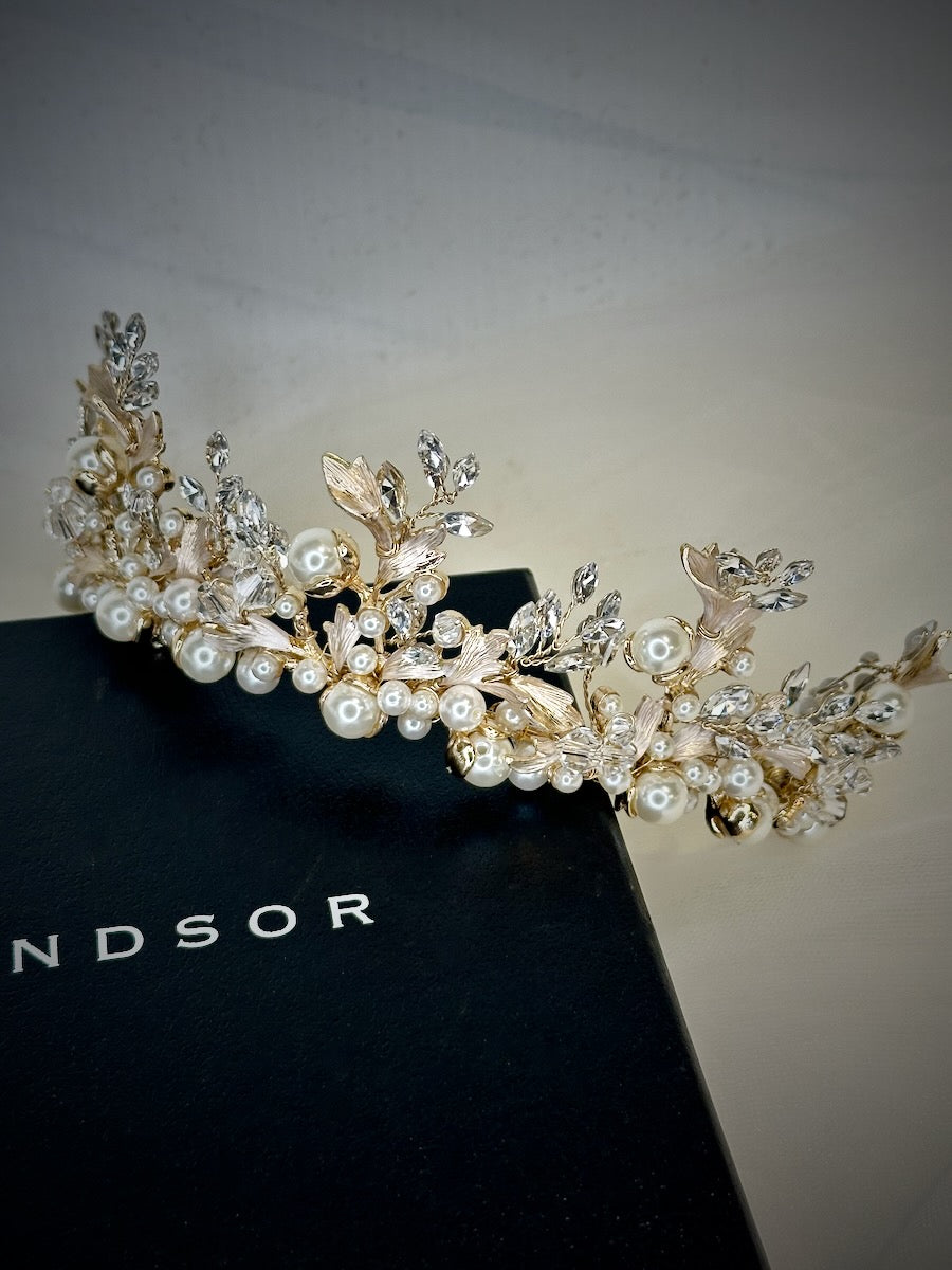 Vienna is a statement headpiece for a confident modern Bride. Pearls are cupped in pale gold cornucopia and raised up by soft gold swirls with sprigs and clusters of crystal. Five detailed motifs stand up from the flexible frame which is so easy to adjust and so comfortable to wear. Handmade in our Australian studio Vienna is a unique and distinctive bridal headpiece to crown the head of a truly lovely Bride.