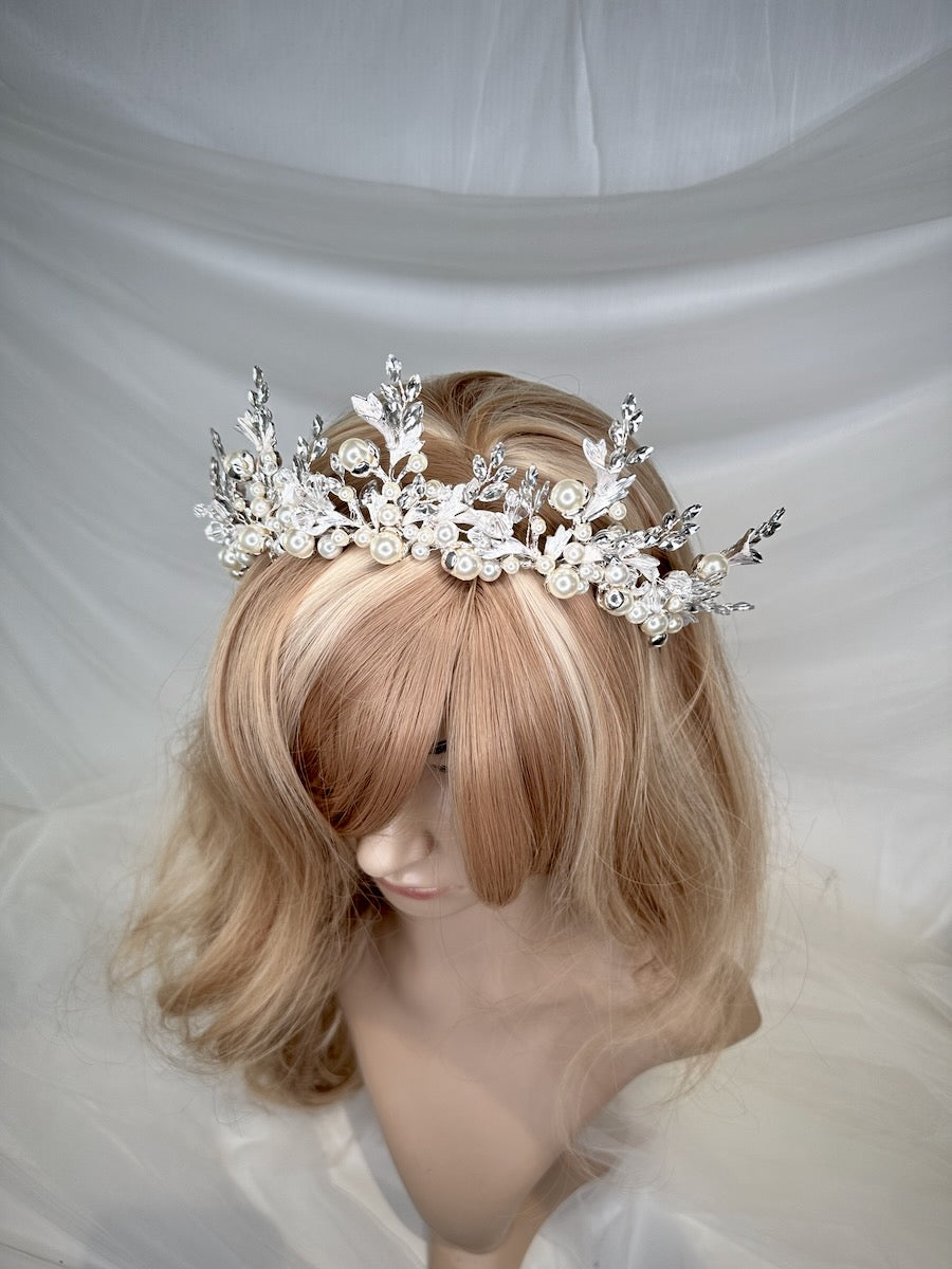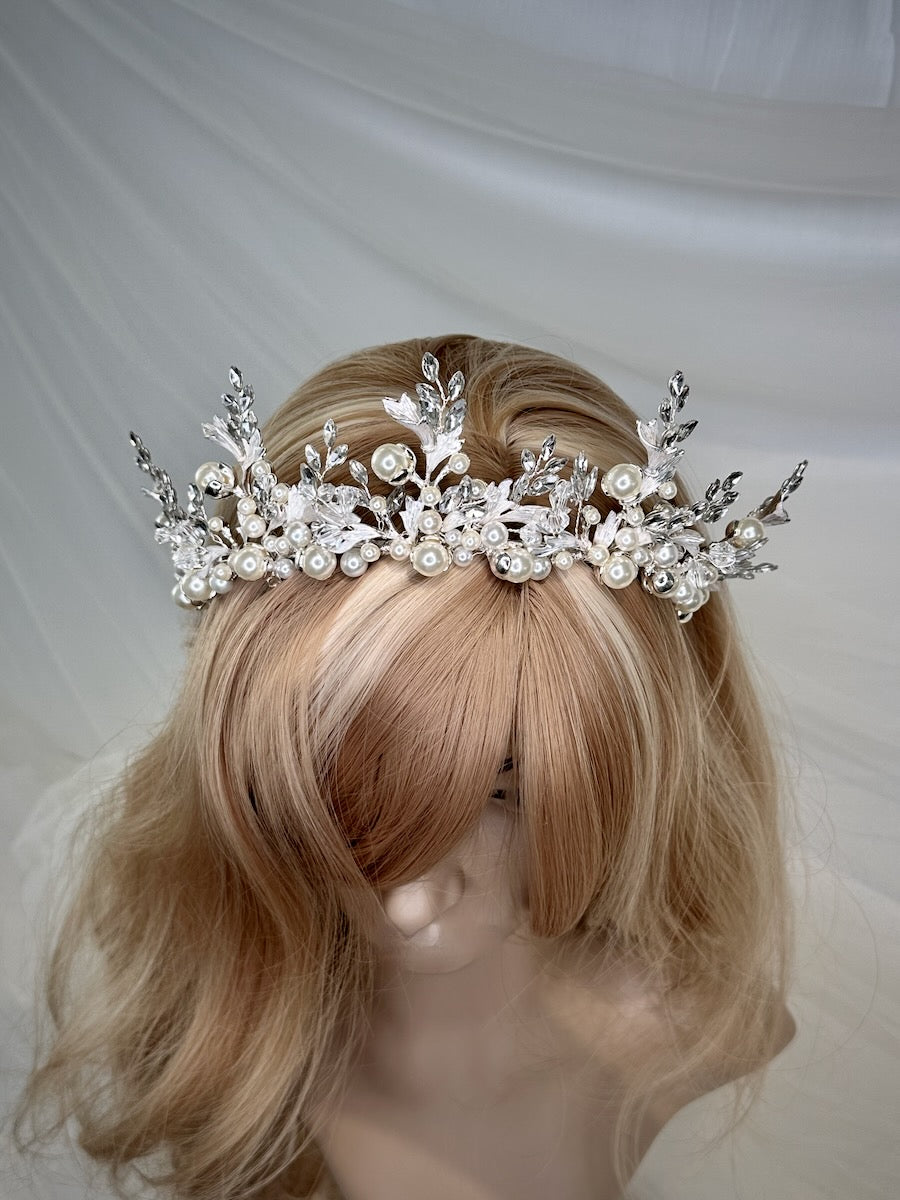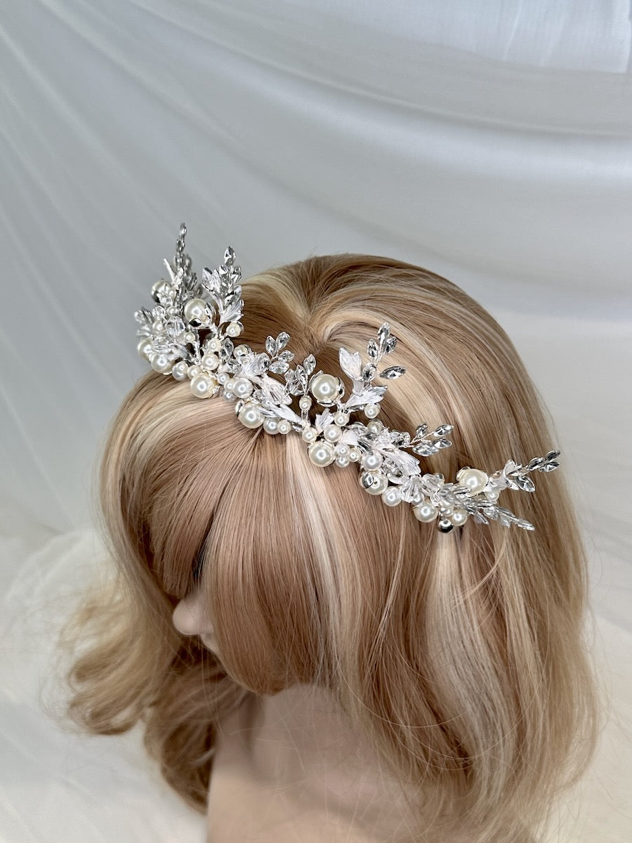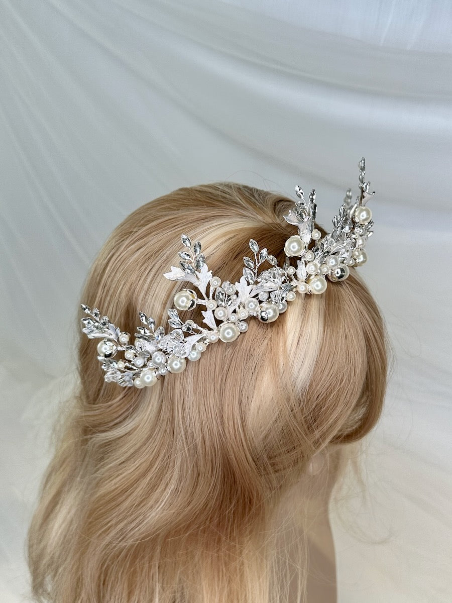 Vienna is a statement headpiece for a confident modern Bride. Pearls are cupped in soft silver cornucopia and raised up by pale silver swirls with sprigs and clusters of crystal. Five detailed motifs stand up from the flexible frame which is so easy to adjust and so comfortable to wear. Handmade in our Australian studio Vienna is a unique and distinctive bridal headpiece to crown the head of a truly lovely Bride.