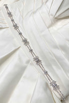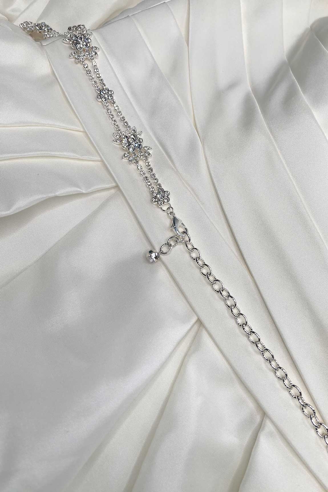 The Gisele is a gorgeous narrow silver belt (1.5cm wide). It features a 60cm crystal-encrusted antique style motif. This design is available as a chain belt 1 metre long inn total or on a narrow diamond white 3m ribbon with the ends of the ribbon trimmed with diamanté stones, this design is a true bridal beauty. The Gisele chain Belt comes with a 40cm extension chain and parrot clip.