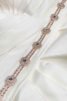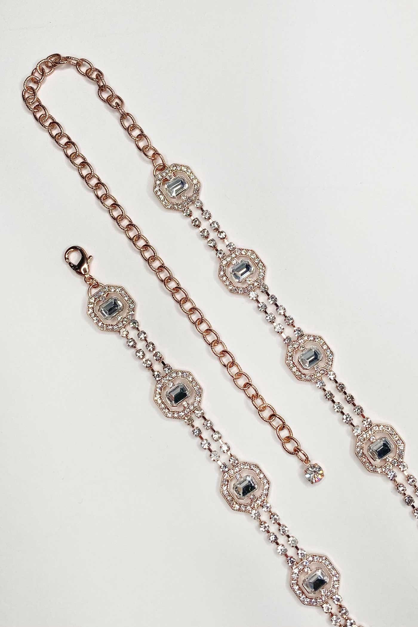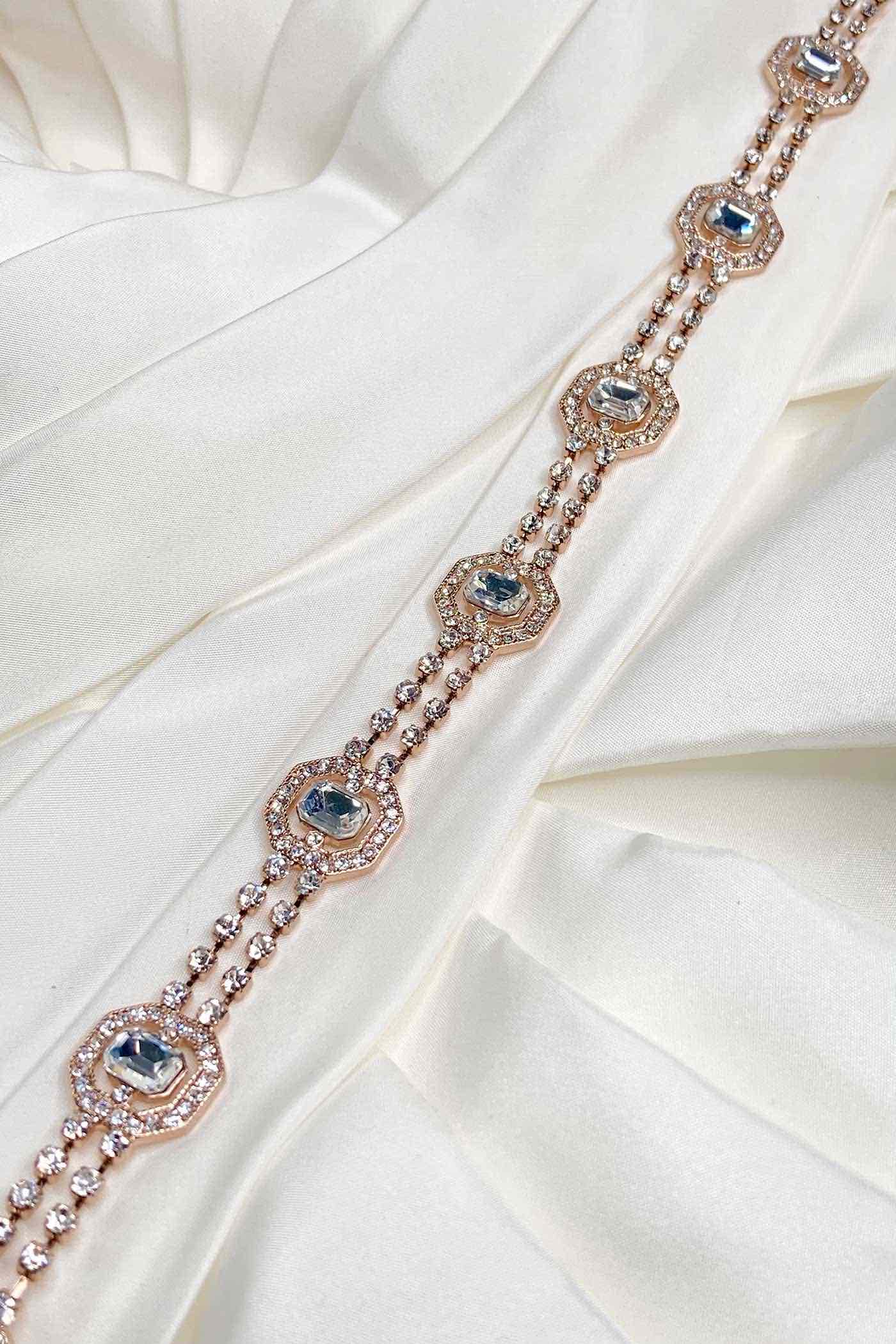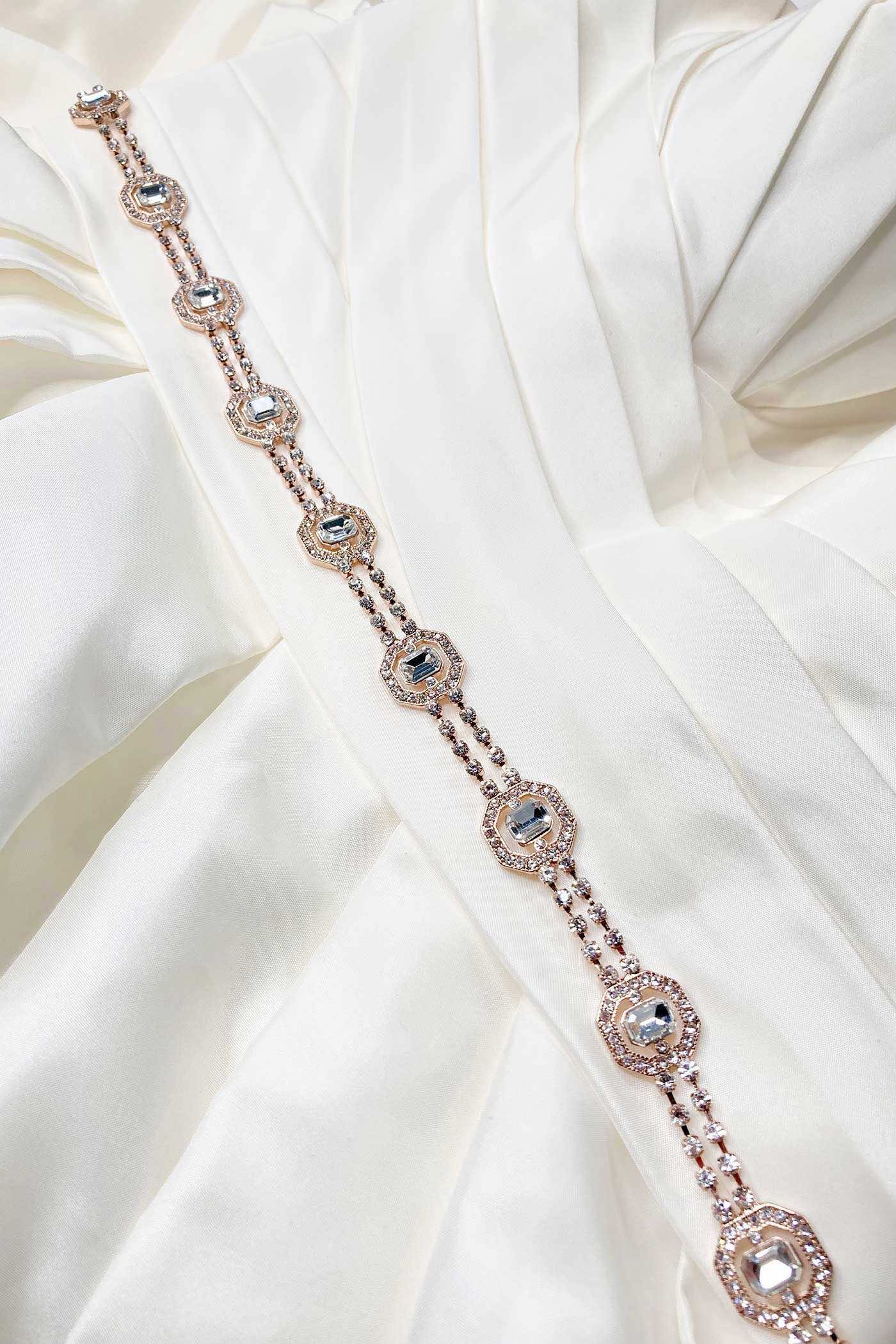 Our London Belt is a gorgeous fine chain belt with beautiful square cut stones in ravishing rose gold - perfect for Brides or Formals. The main part of the belt is about 60 cm long with about 30cm of extension chain so it adjust to most waist sizes. It is fitted with an easy parrot clip fitting at the back.