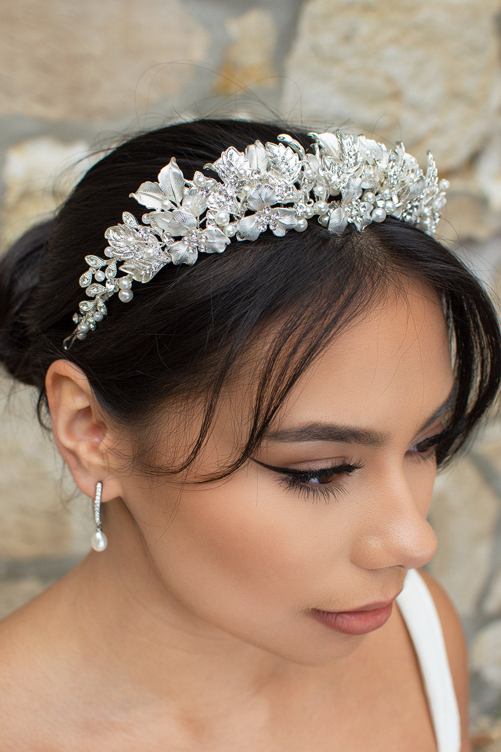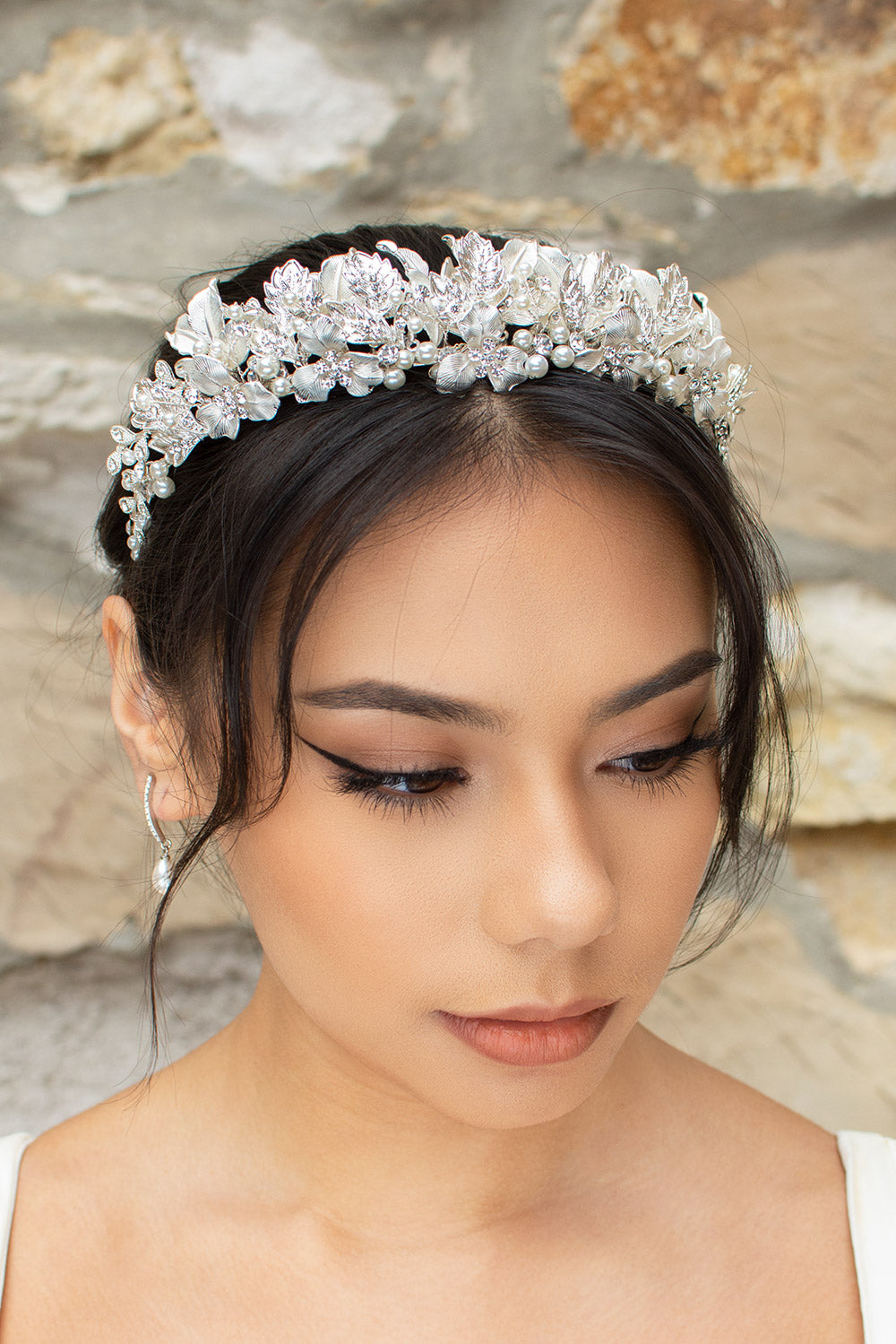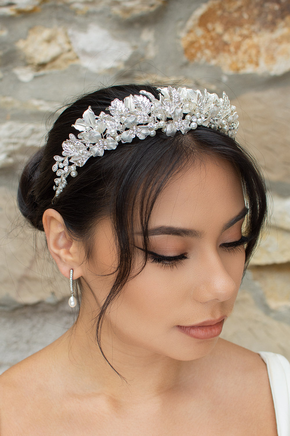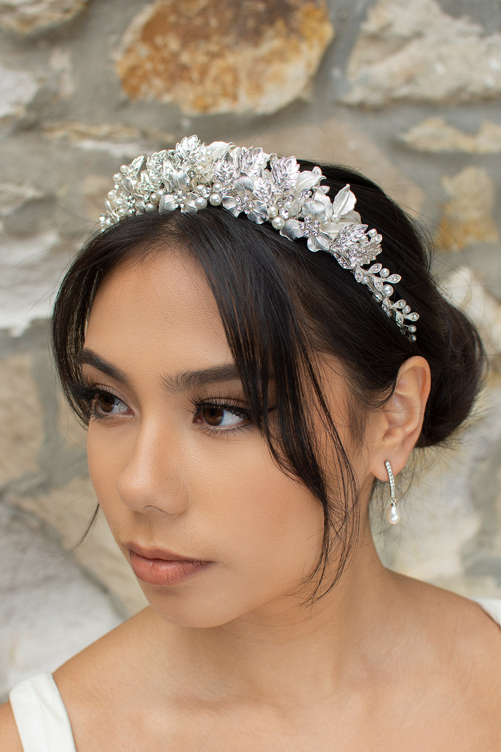 Stunning in silver, Hannah is a beautiful bridal headpiece design. An arrangement of silver pearlescent leaves and floral elements embellished with tiny pearls and crystals combine to create a sweet sensation that is Hannah. With delicate crystal and pearl detailing, Hannah will radiate with beauty and elegance. Lightweight and easily adjusted for individual comfort and style preference, Hannah will have you looking like a picture-perfect princess on your wedding day.