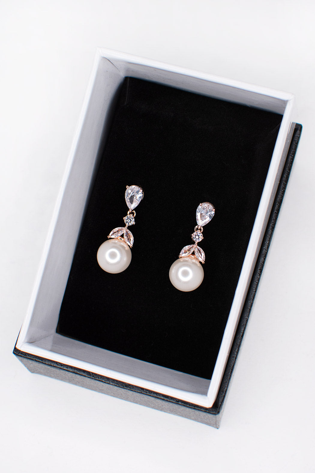 Held by a gleaming teardrop crystal at the post, Betty's dainty single Pearl is surrounded by leaf like navette shaped crystals that carry worlds full of light and shine. Beautifully set in rose gold plating, Betty is a charming pair of bridal earrings suitable for brides, bridesmaids and formal wear.