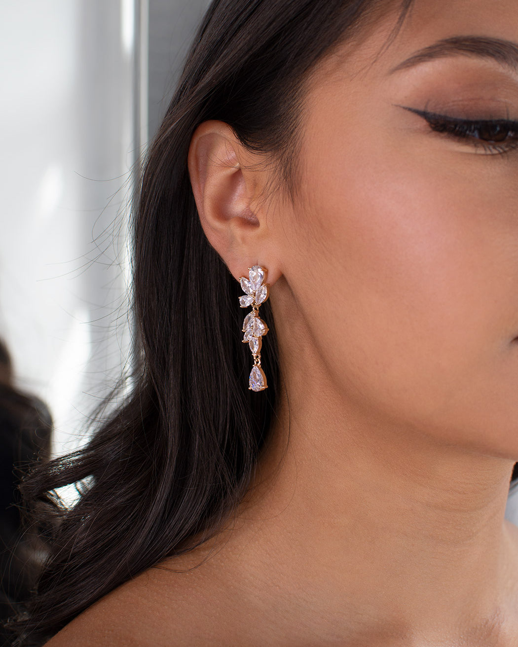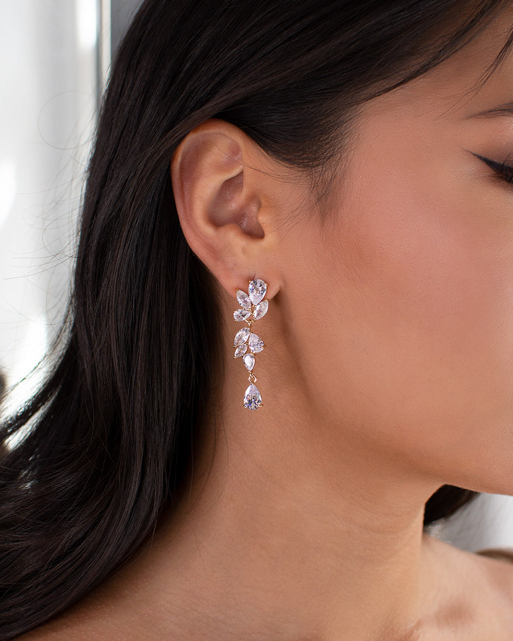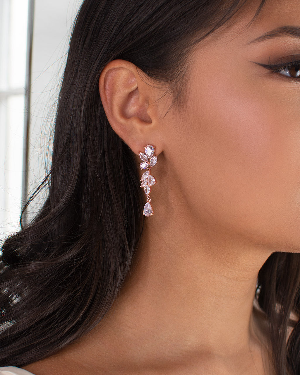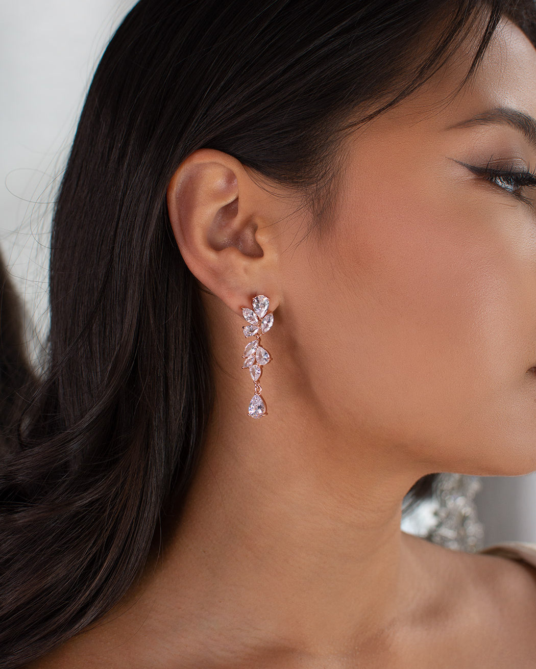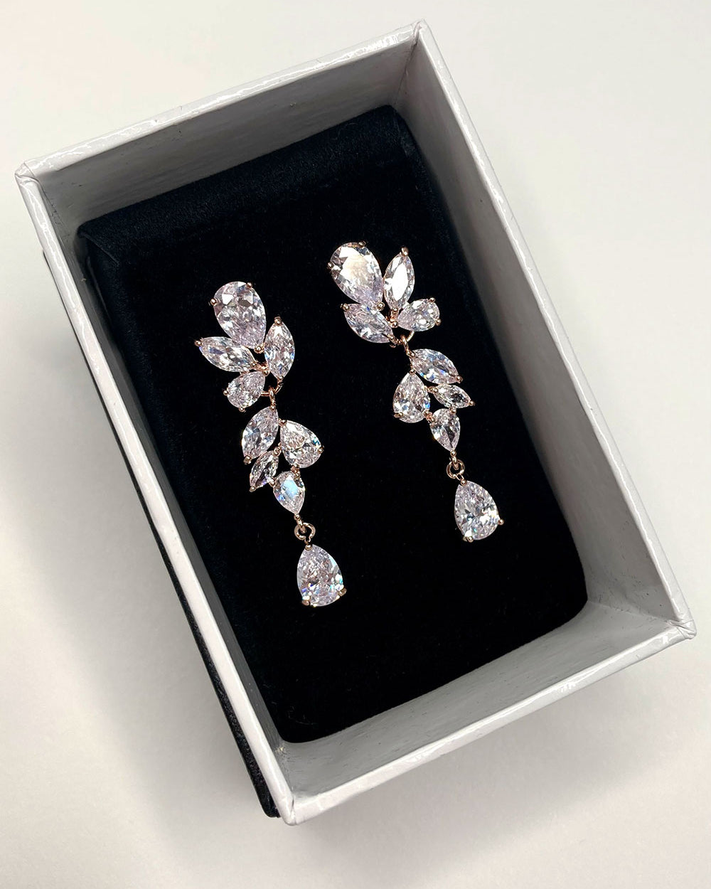 The double-size version of the Claire earring, Claudia is a stunning long-drop statement earring. Claudia will turn heads as the beautiful imitation diamonds capture and dazzle with light and its elegant extended length and pale rose gold finish. Claudia is approximately 8cm in length, 1cm in width and is 16 grams in weight. Claudia is a lovely superior quality piece featuring pear shape and navette shape stones.