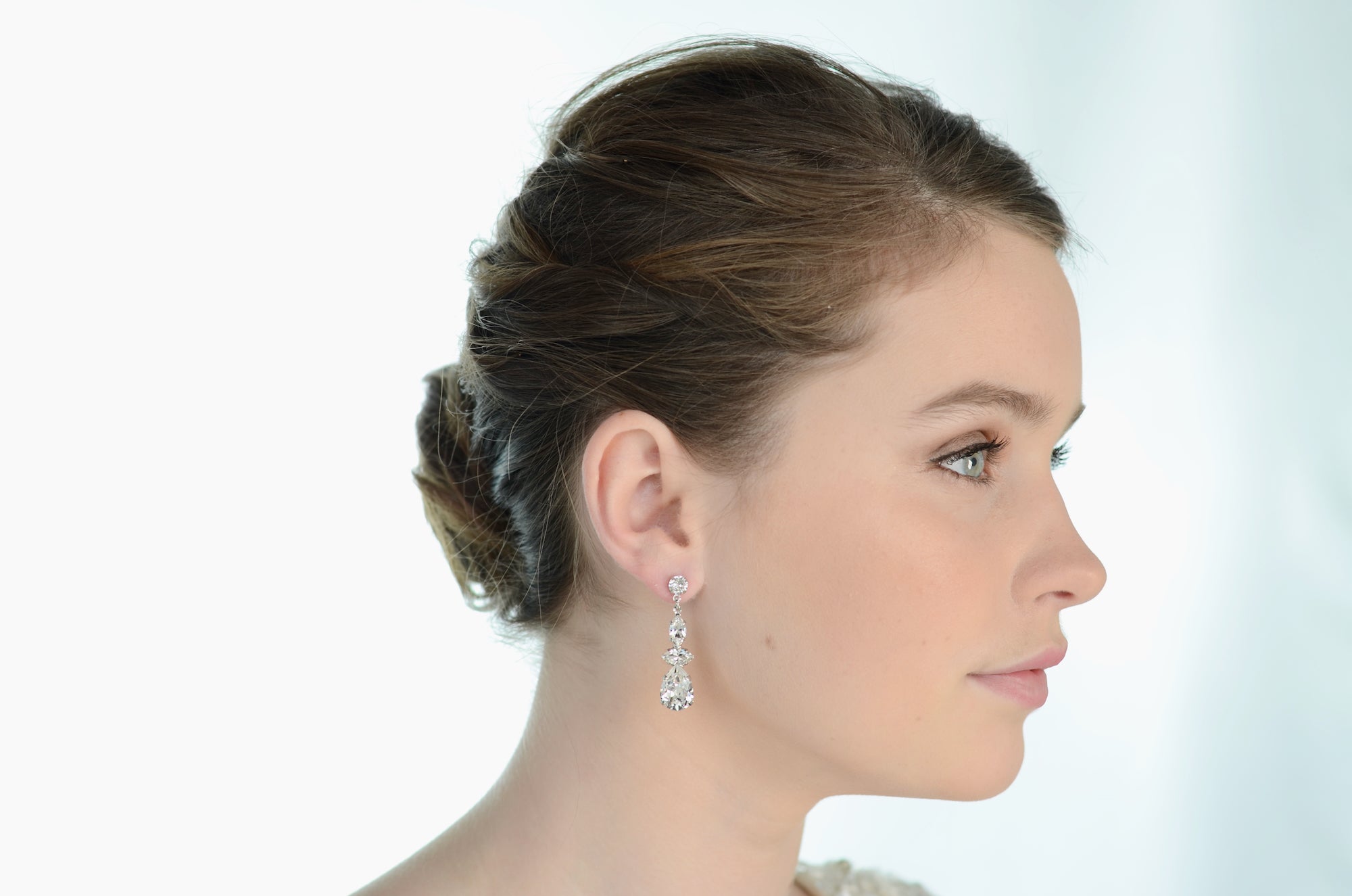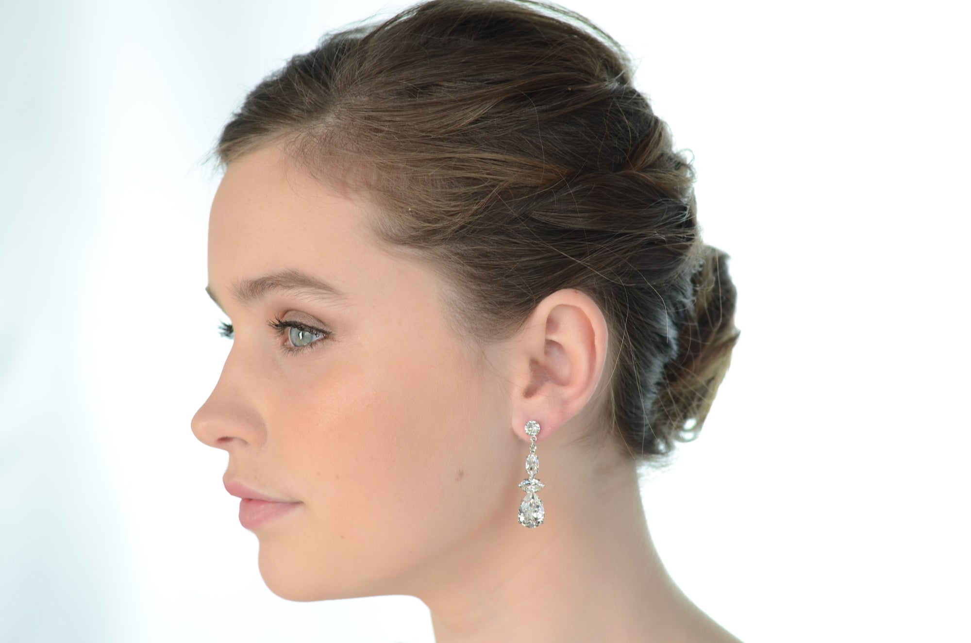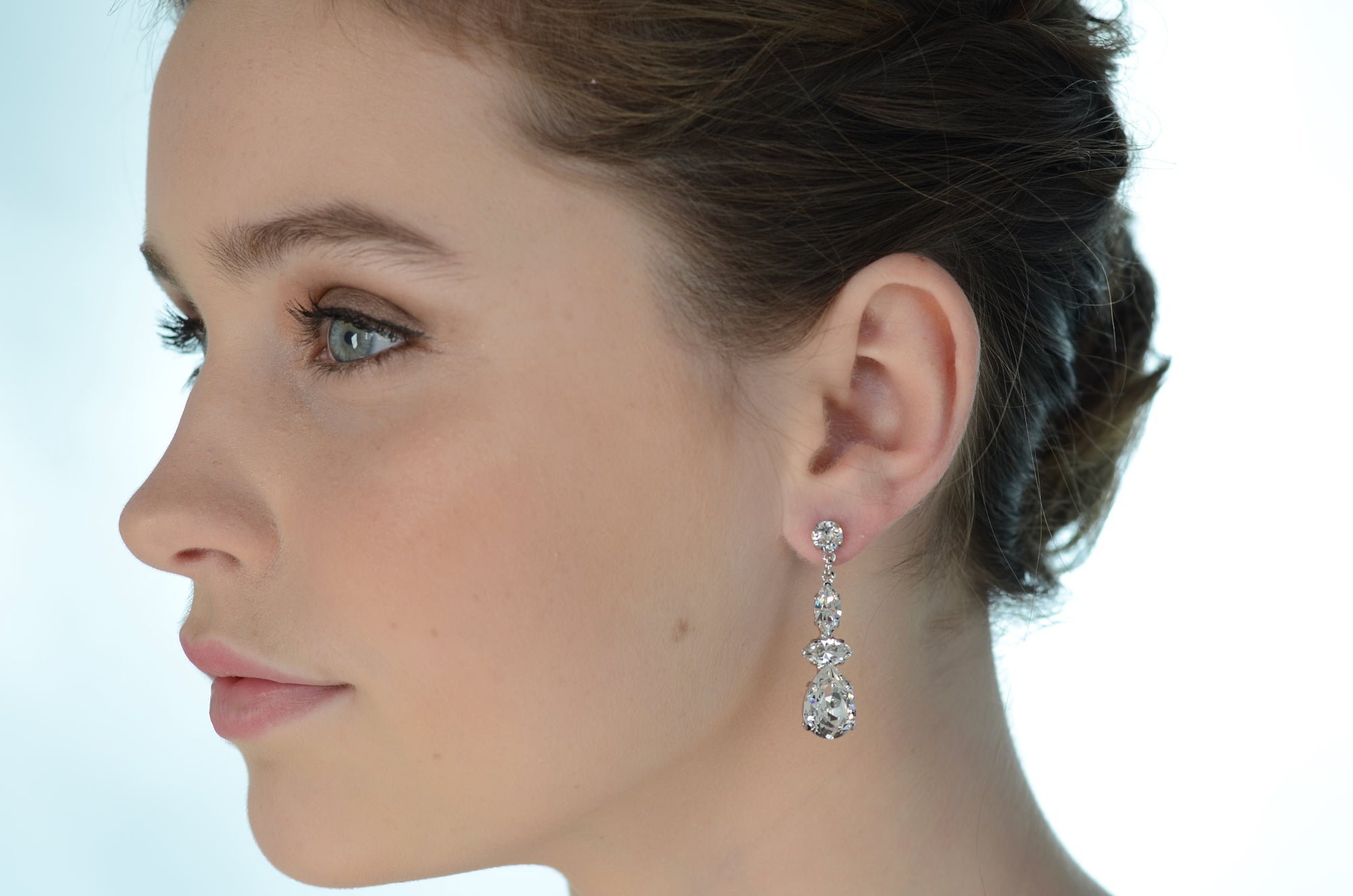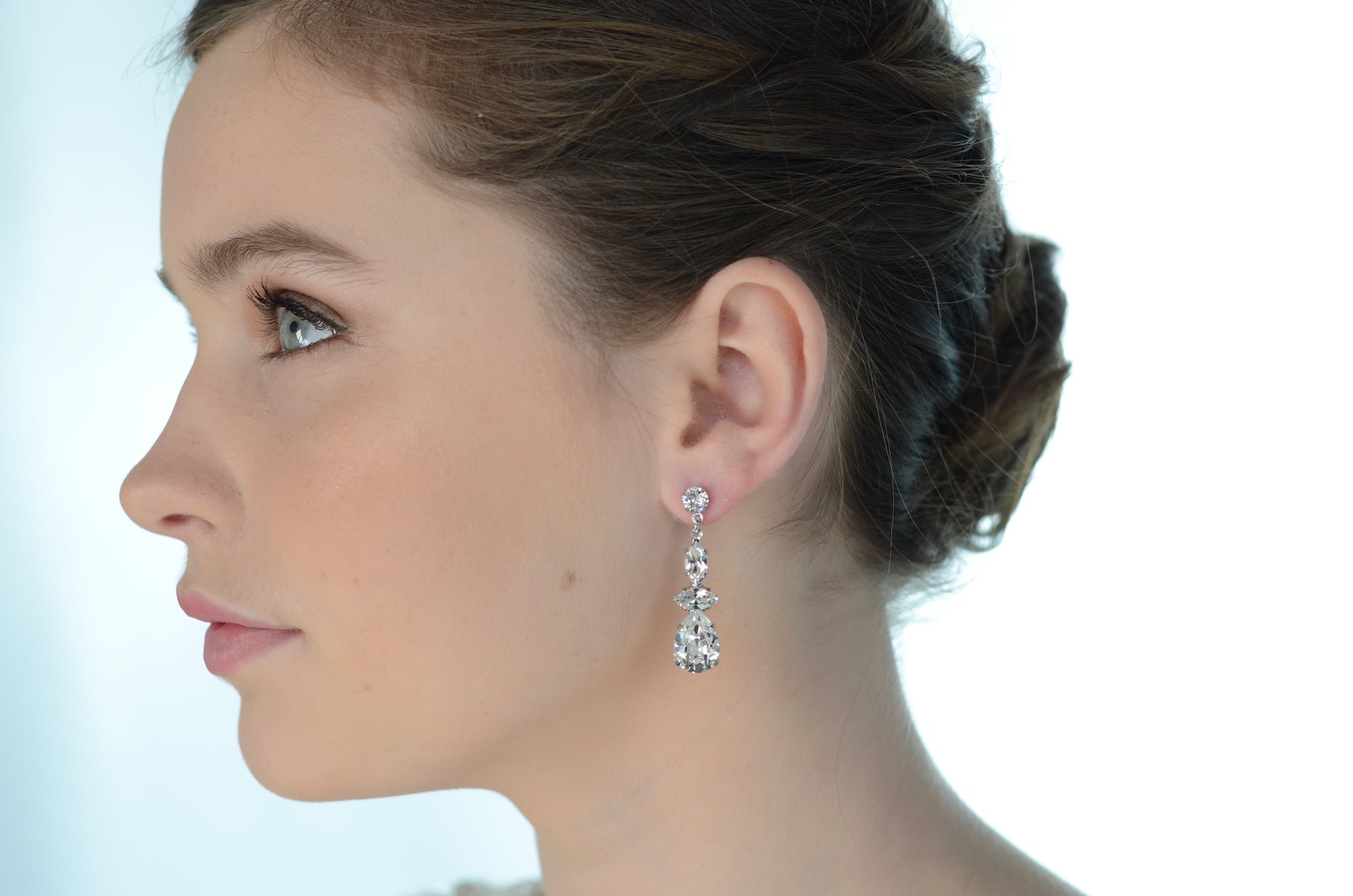 Eliza is the perfect medium drop Swarovski crystal earring with a stunning classic design. Every part is sourced from Europe or the USA to hand make this medium length drop earring of quality. The Swarovski stones are individually set into the claw settings by hand. The metal settings are in lasting bright silver finish that looks expensive and better allows the facets of the Swarovski stones to split the light into a myriad of colours. Eliza has post fittings for your pierced ears.