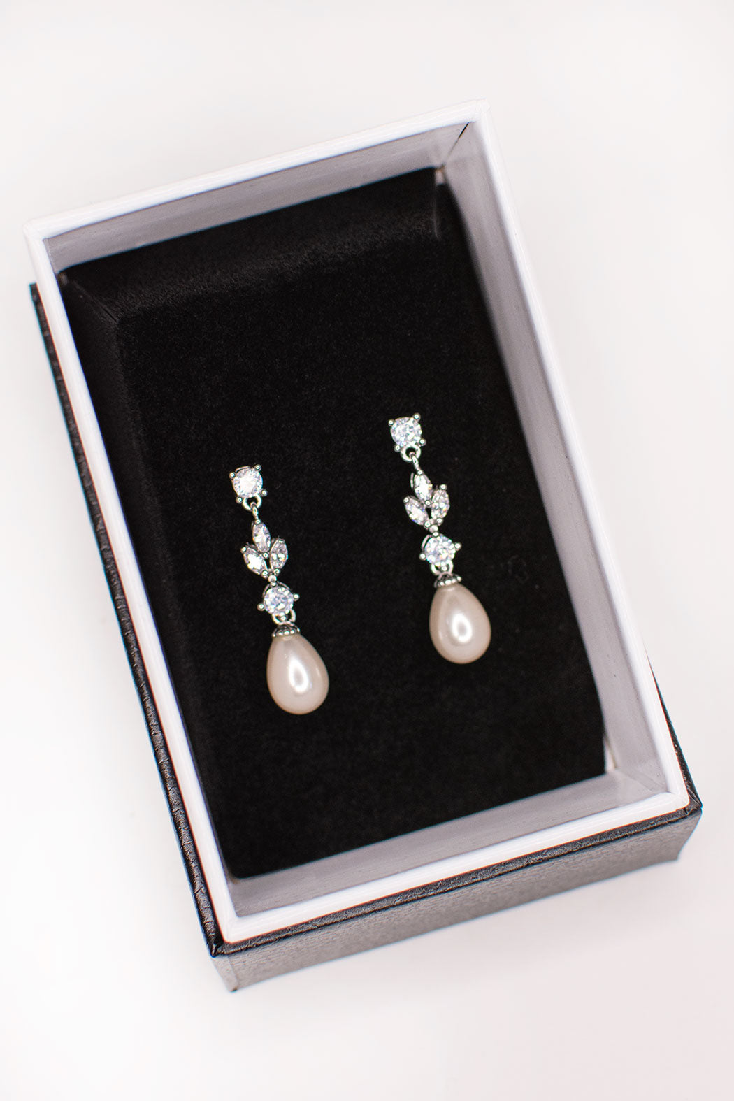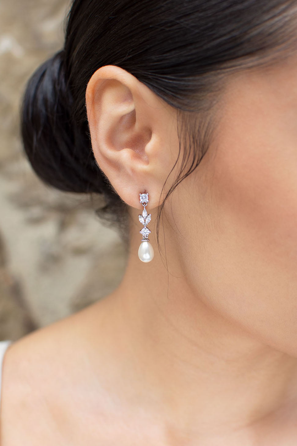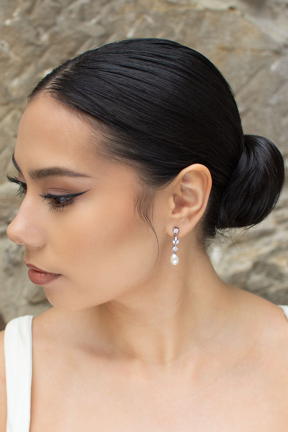 The perfect bridal earring, Tara is a stunning long drop earring made with sparkling stones and a beautifully perfect pearl drop. Tara features tiny navette crystals in the centre atop the pearl drop that both gleam and shine as you move, an earring perfect for both Brides and Bridesmaids. Delicate and detailed, Tara will dress your bridal ensemble with divinity and elegance.