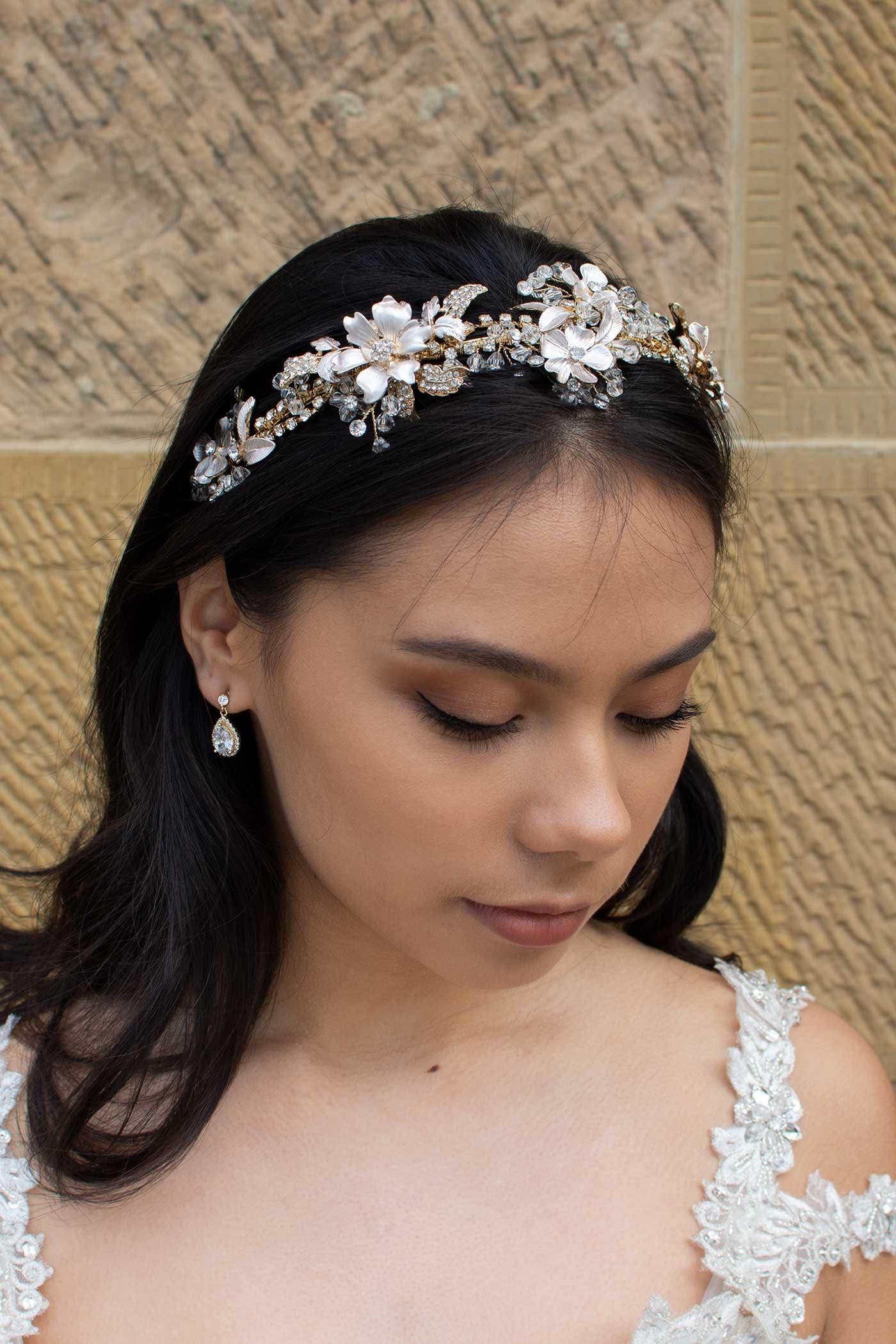Your search for the perfect gold bridal hair embellishment is a thing of the past, now that you have discovered our Astor design. Bejewelled with a double row of crystals and perfectly ornamented with magnificently ornate pale gold and crystal flower details, the Astor is one in a million. The perfectly placed crystal stone flowers and crystal-encrusted leaves make the Astor headband everything you need to complement your gorgeous bridal hair and make-up.