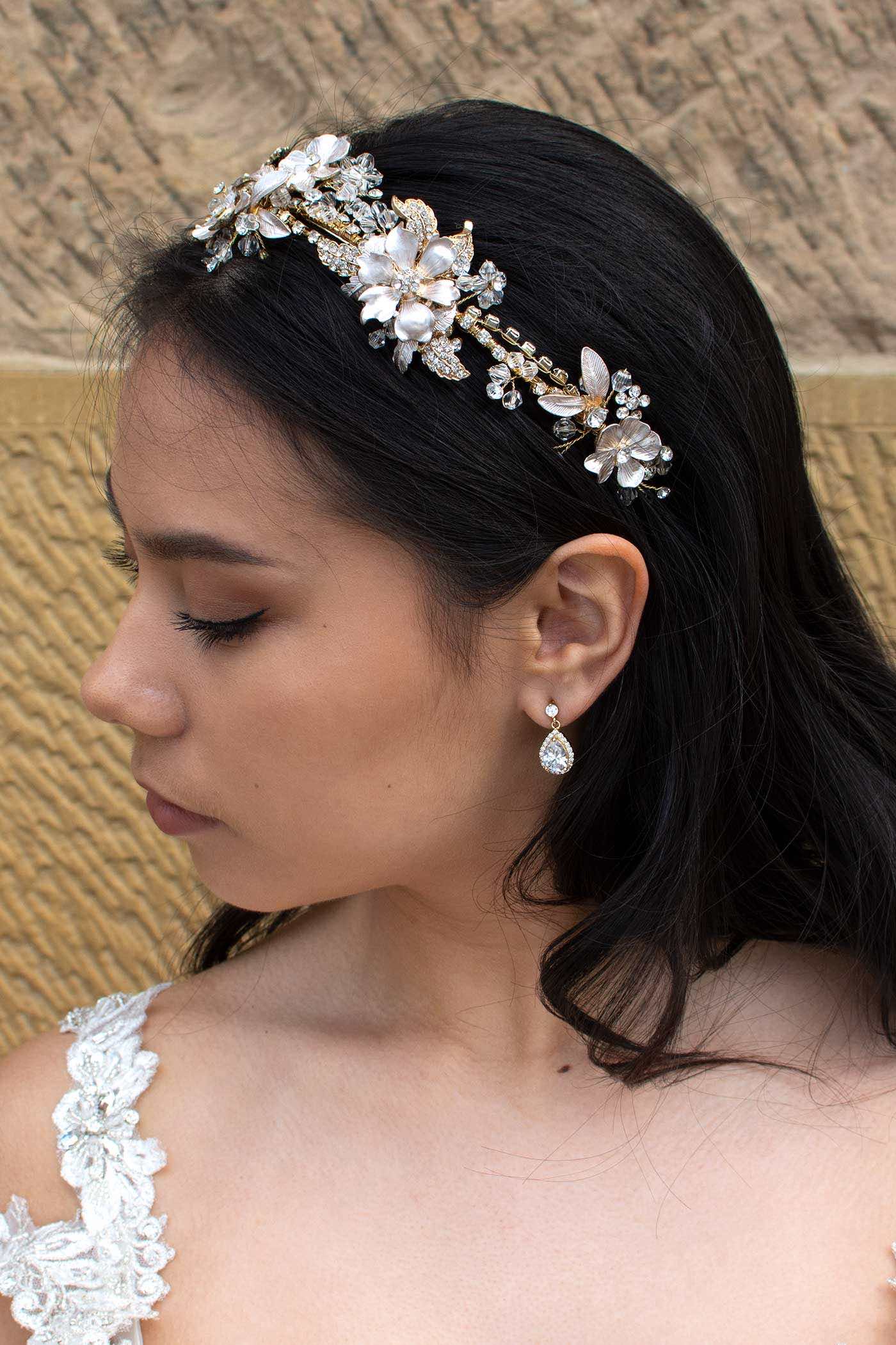 The Astor Headband in Gold arches over your head with three magnificently detailed flowers, with a soft pearl finish over the leaves. A double row of crystals flows along the length of the band, with clusters of crystal beads and round crystal stones. The flowers motifs are gently framed by palest gold shimmering leaves, surrounded with clusters of transparent crystal that split the light. The frame of our Astor Headband is a soft, bendable yet firm band and shapes easily to any head without pressure.