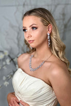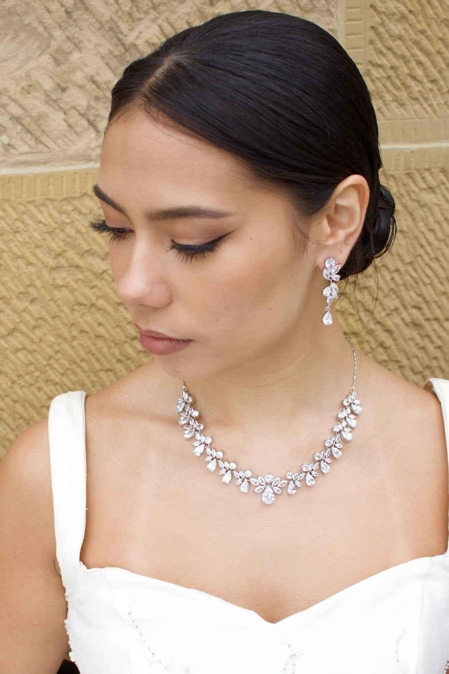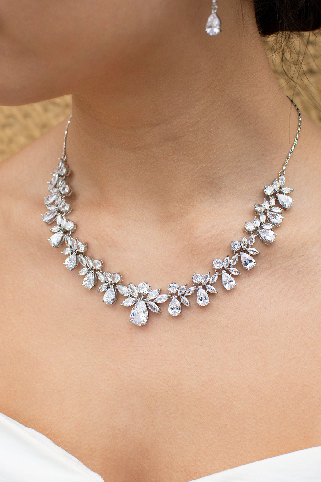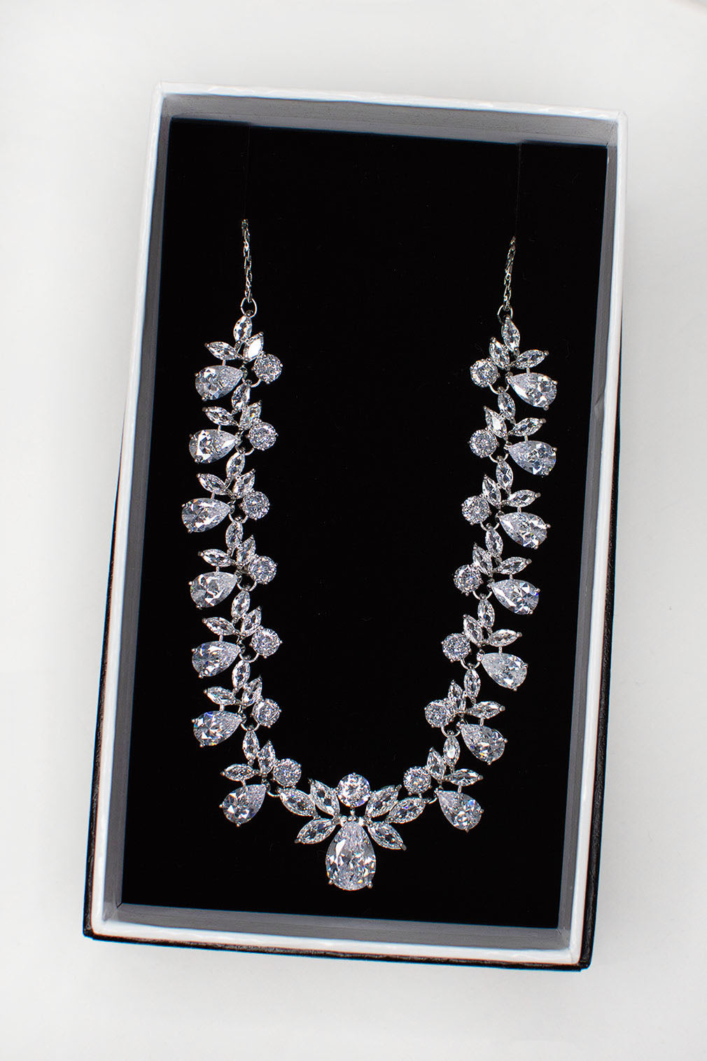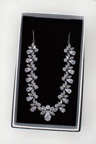 If you are a Bride looking for a beautiful statement necklace to wow your family and friends as you glide down the aisle on your magical wedding day - then choose Annalise to make you the most elegant of Brides. Beautiful stones descend in glistening cascades to a magnificent centre pear shape stone. The finish of white gold (rhodium) truly enhances this superb quality bridal necklace.