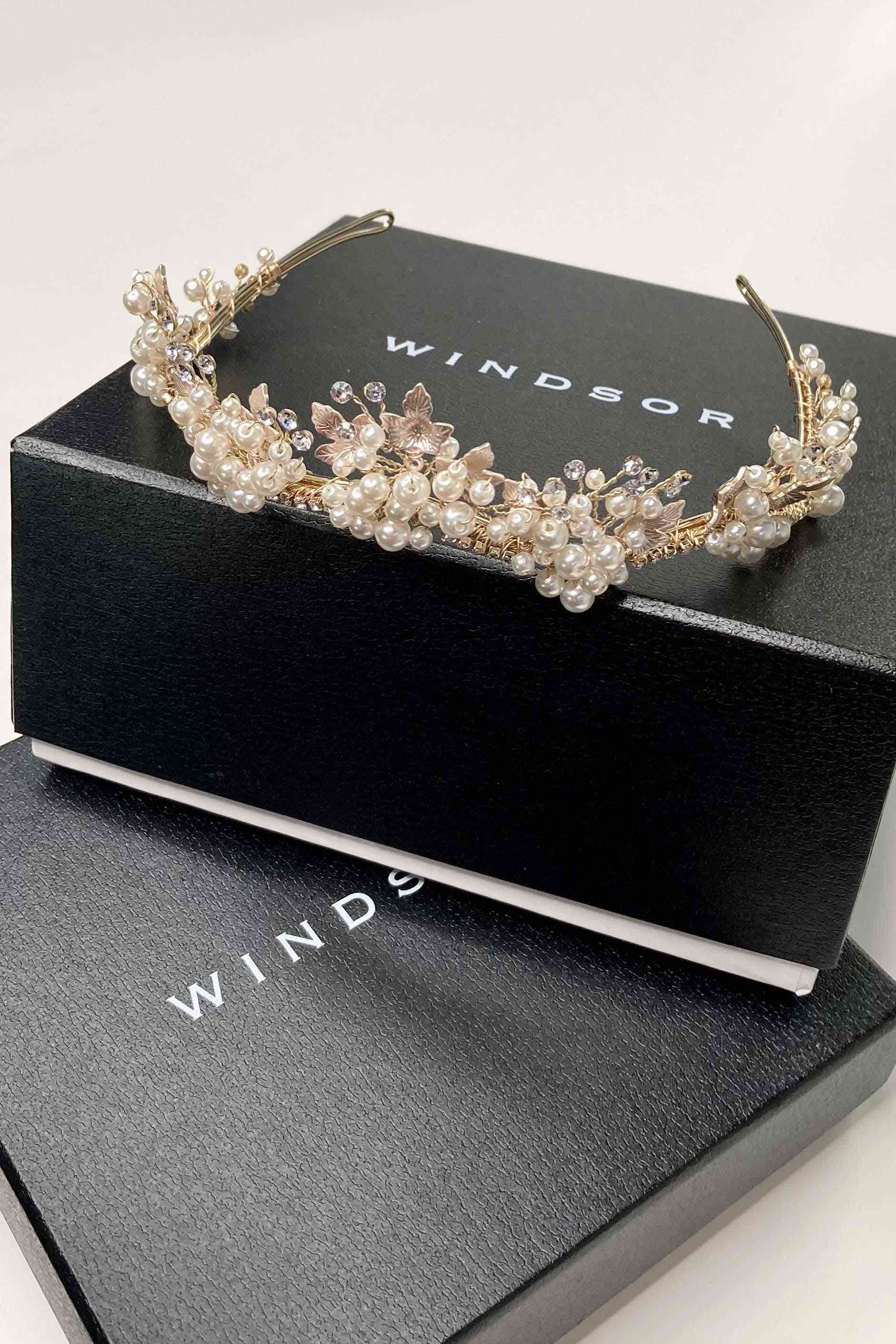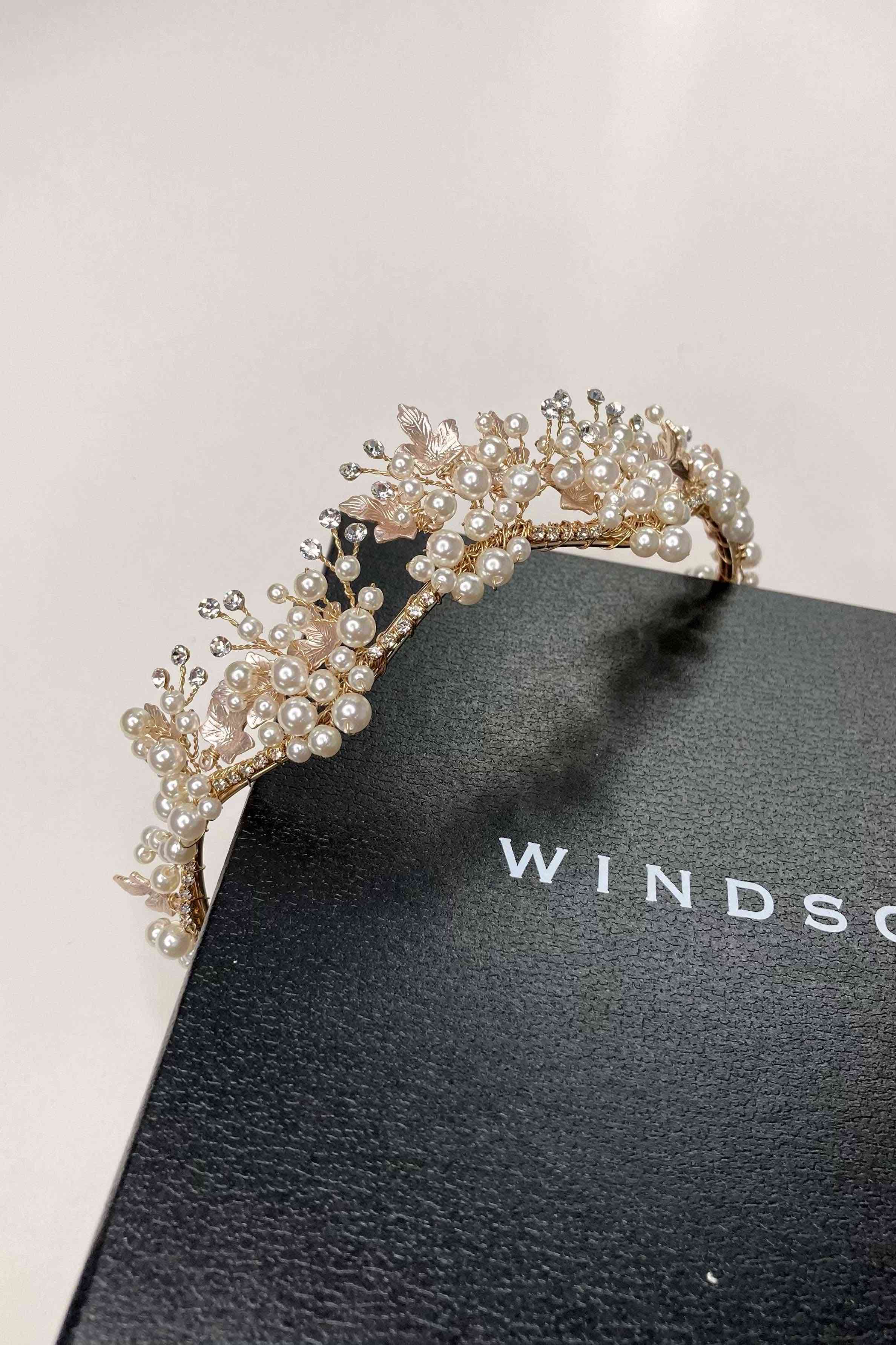 With glistening sprigs of pearl and a touch of crystal, Anita is a beautiful five-point tiara that will adorn your head with classical elegance. With an abundance of extra pearls in the Gold variation, Anita's leafy pearl design pairs perfectly with a modern dress or an elegant up-do hairstyle; An elegant minimal tiara for the modern bride. The metal frame of the Anita is complete with small crystals and pearls adoring the entire front of the tiara. The frame itself is bendable, allowing for the crown to be easily shaped to your head with no tight pressure when wearing so that you can have a headache-free breeze of a wedding day