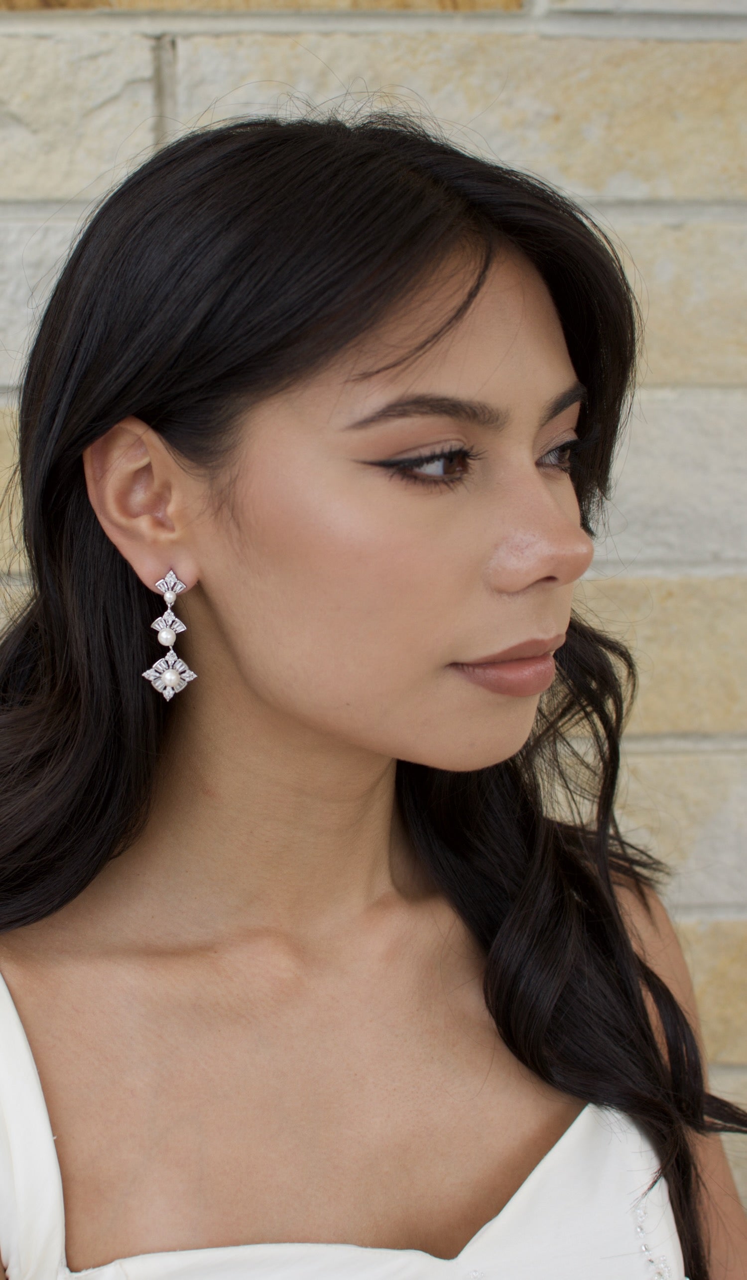 Feel the centre of attention in stylish and unique Aspen on your wedding day. The lovely Aspen is a beautiful tiered Bridal Earring intricately hand set with tiny crystals and pearl centres. Forming a tier the beautiful open back crystals glimmer and glow. The workmanship on this piece is very fine.