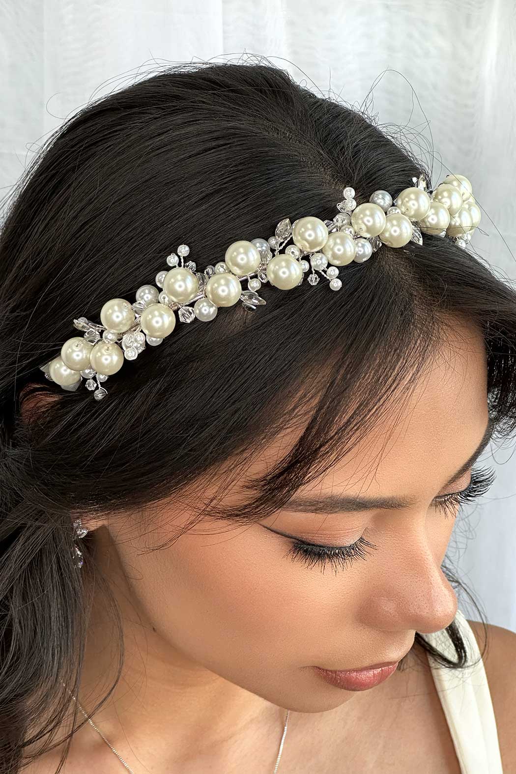 Cherry is a statement pearl bridal headband with beautiful glass pearls and sprays of clear crystal stones. Modern and minimal Cherry will top your ensemble as you make an entrance on your special wedding day. In bright silver and on a flexible light frame this hand made in Australia piece is made for Brides who just need a lovely headband to complete their look. The glass based pearls are a pale ivory shade that matches exactly with so many Bridal gowns. Touches of crystal add shine and that softening touch to fill out the piece and give it depth.