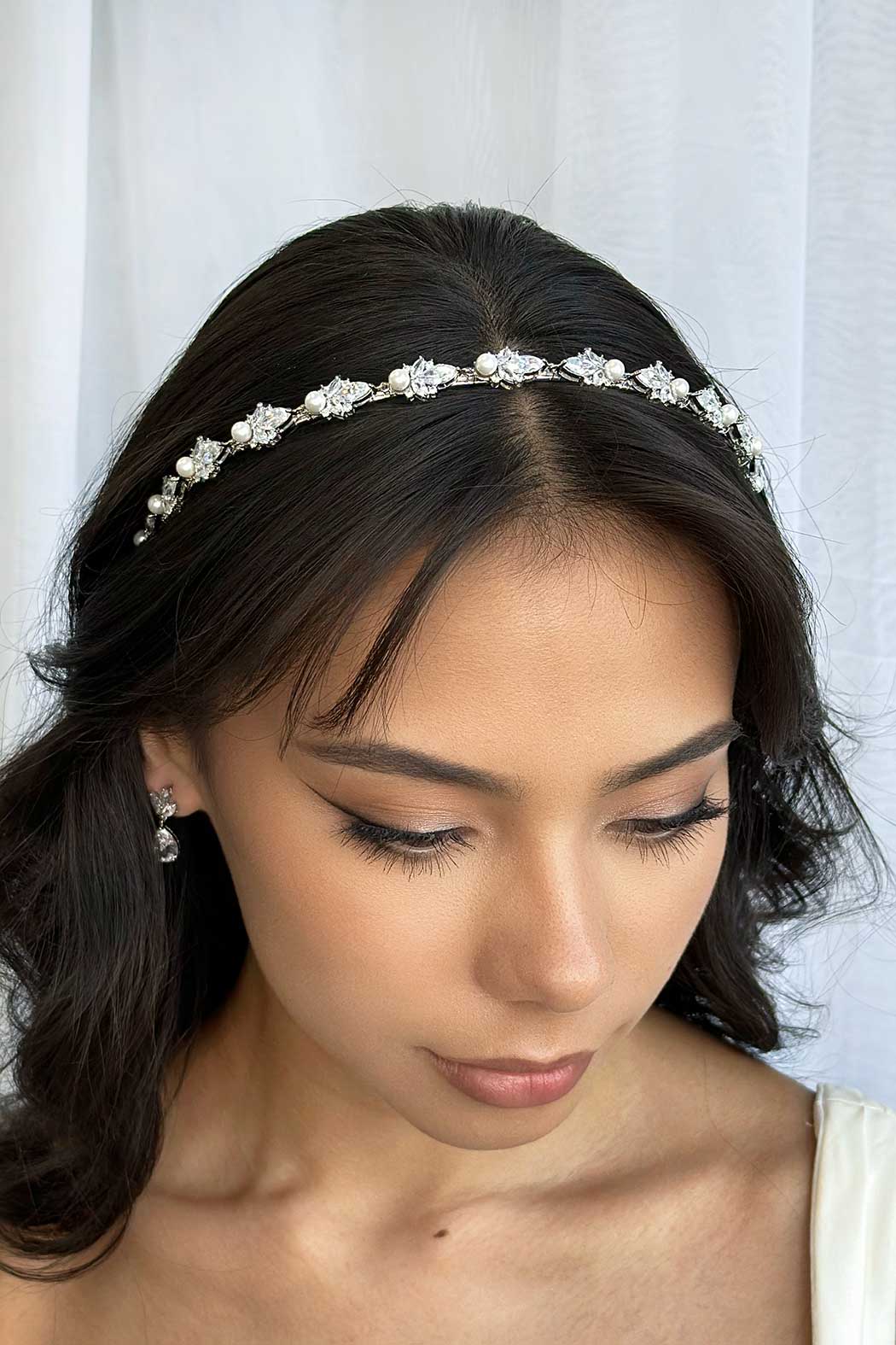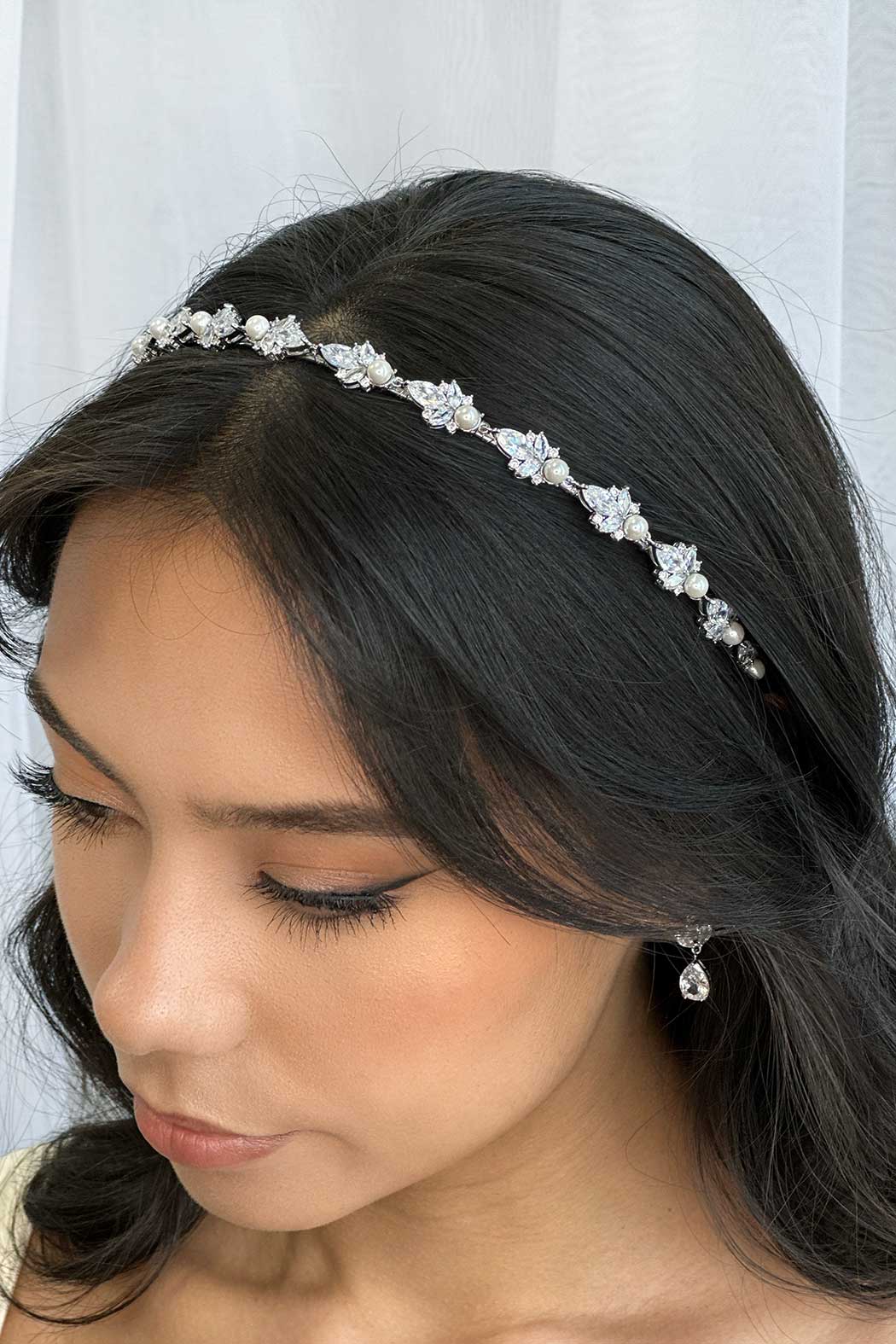 Stand out and make a statement on your wedding day in this Art Deco inspired fine headband. Made in our studio, this lovely and distinctive piece adorns crystal with a touch of pearl all hand set and linked together.