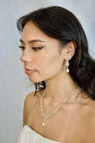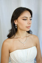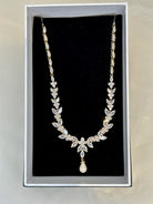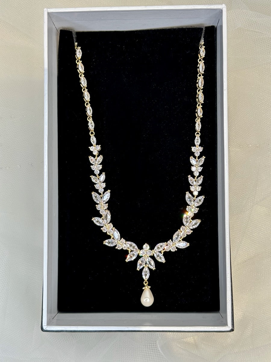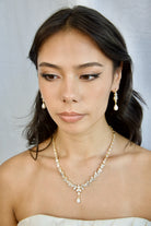 A crystal wonder, Corrina is a glamorous pale gold crystal necklace with a drop pearl perfect for a Princess.  Corrina can be worn long or short, featuring an extension chain that allows for a choker length or full length necklace. With shimmering crystals that reflect the light, Corrina is a necklace that will have everyone in awe. For that princess feel, choose Corrina for your special day. Suitable for Brides, Bridesmaids and Formal occasions.