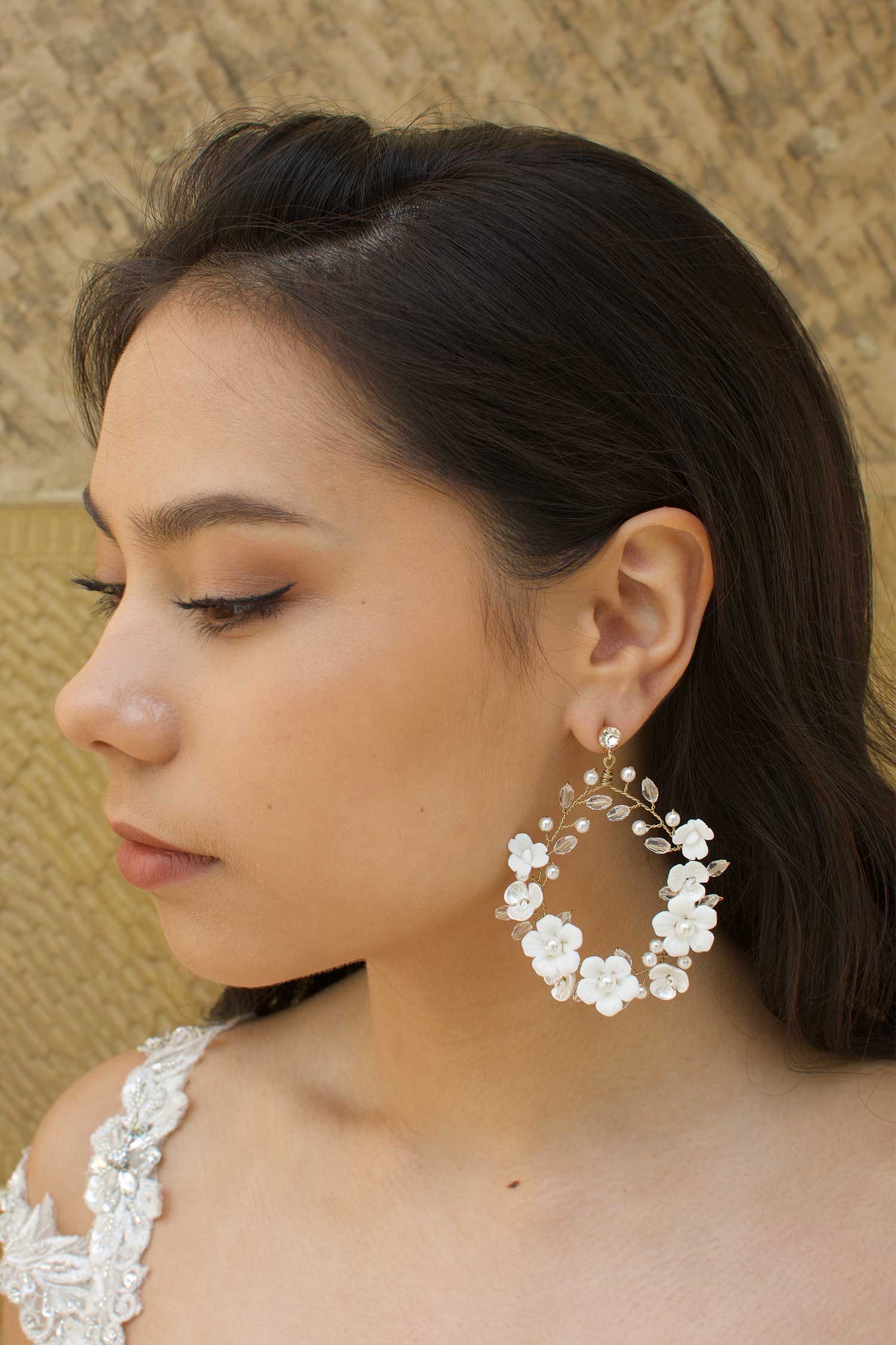 Ettie is a unique gold bridal hoop earring featuring romantic ceramic flower elements entwined with pearl and crystal flourishes. This beautiful statement earring is sure to turn heads for all the right reasons as you make you way down the aisle.