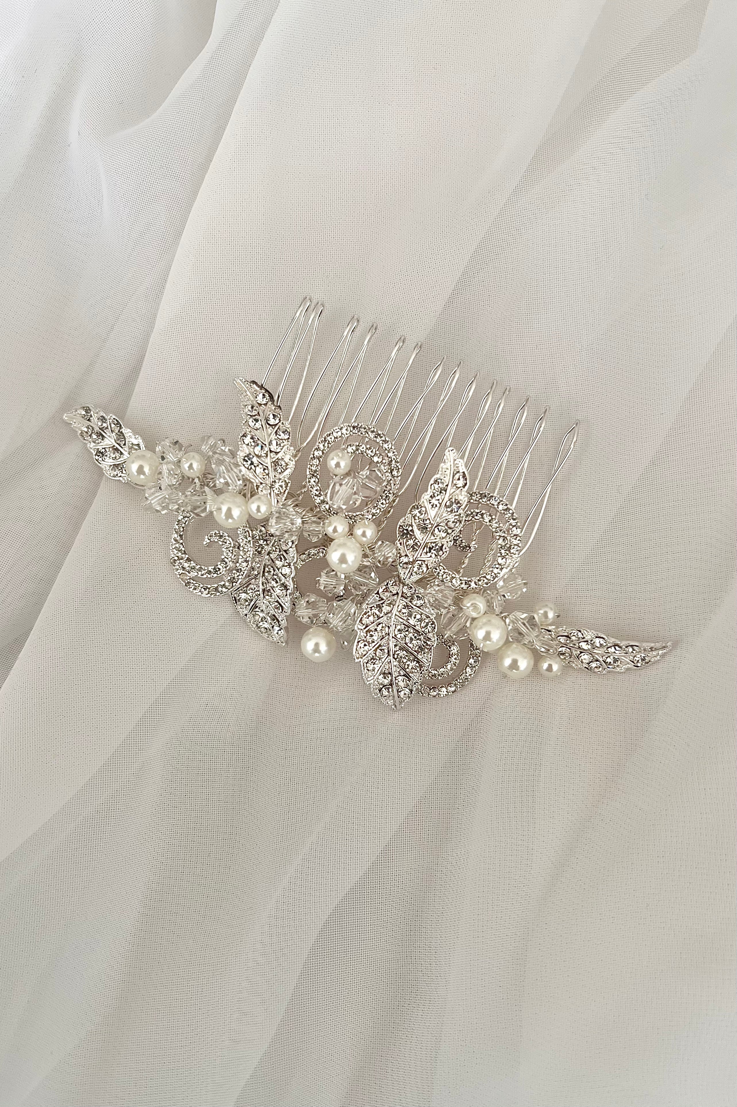 The beautiful Floriane Comb is a magnificent design of encrusted crystals and leaves showcased by elegant swirls. Dots of crystals and pearl elevate the comb with fine detail. Its perfect for the back of the bun and sits beautifully with its symmetrical design. Wear above the comb of a veil and leave her in your hair all night long. Floriane will make you feel like the most beautiful bride.