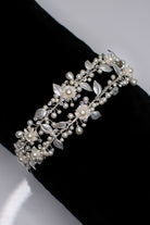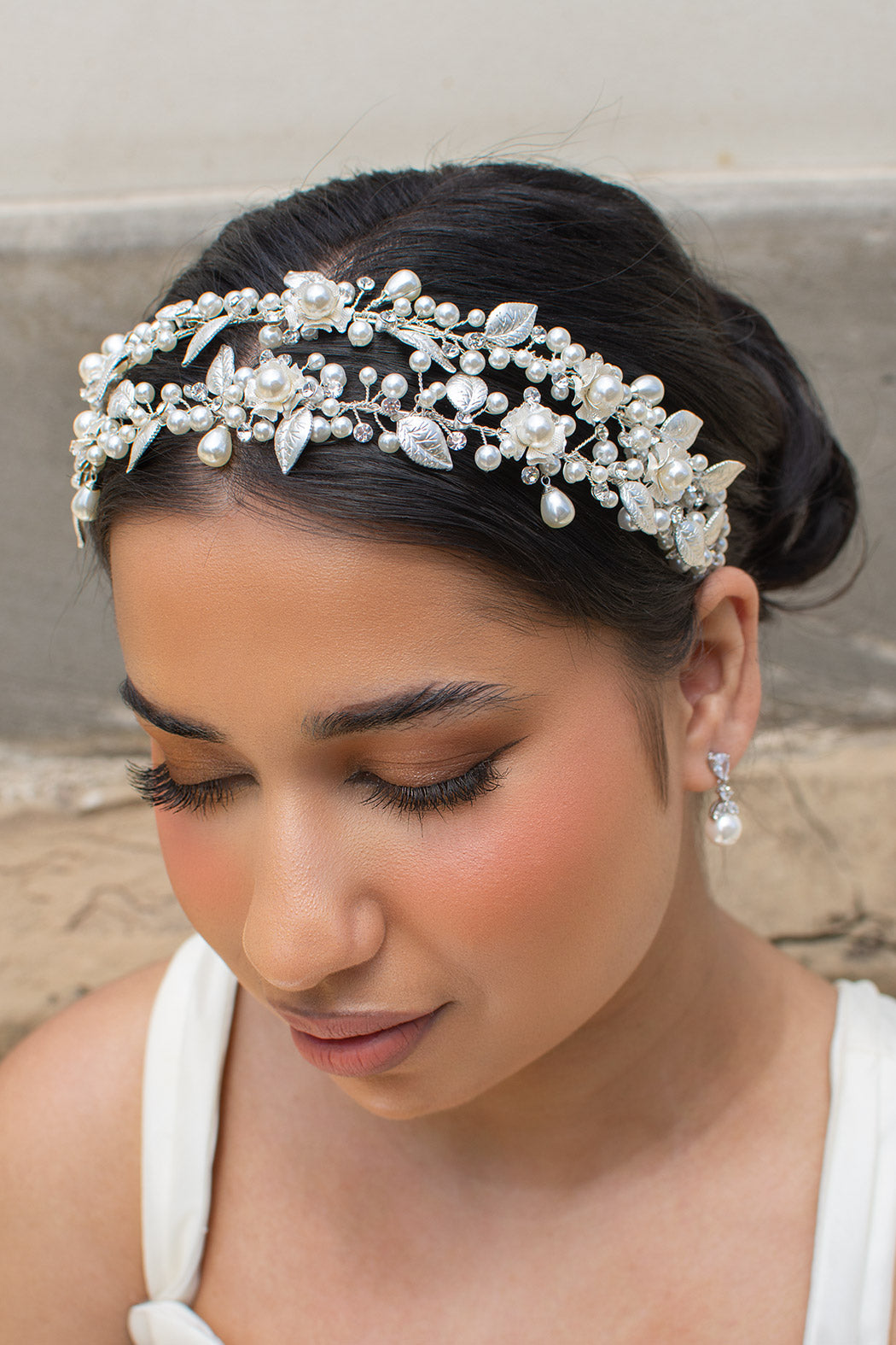 Holly is the essence of subtle elegance with soft pearlescent silver leaves and beautiful pearls nestling in tiny flowers. She is a lovely double row headband that can be adjusted to have the two rows a bit closer or farther apart.