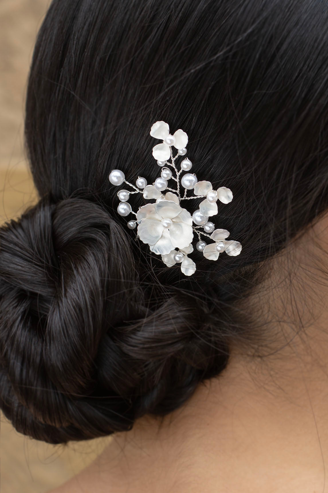 A beautiful hairpin with a fine flower hand painted with a white effect. Pearls and sprigs of pearls surround the flower. This is an ideal choice for Bridesmaids or Flower girls to match with the Bride wearing a larger comb or headpiece in exactly the same components. Available in all three shades Bright Silver, Pale Gold and Pale Rose Gold