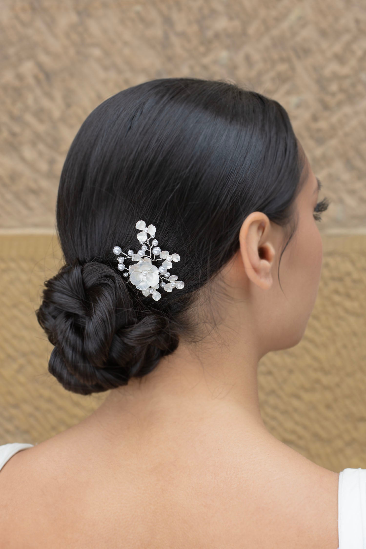 A matching hair pin to the Iris White Silver Side Comb.