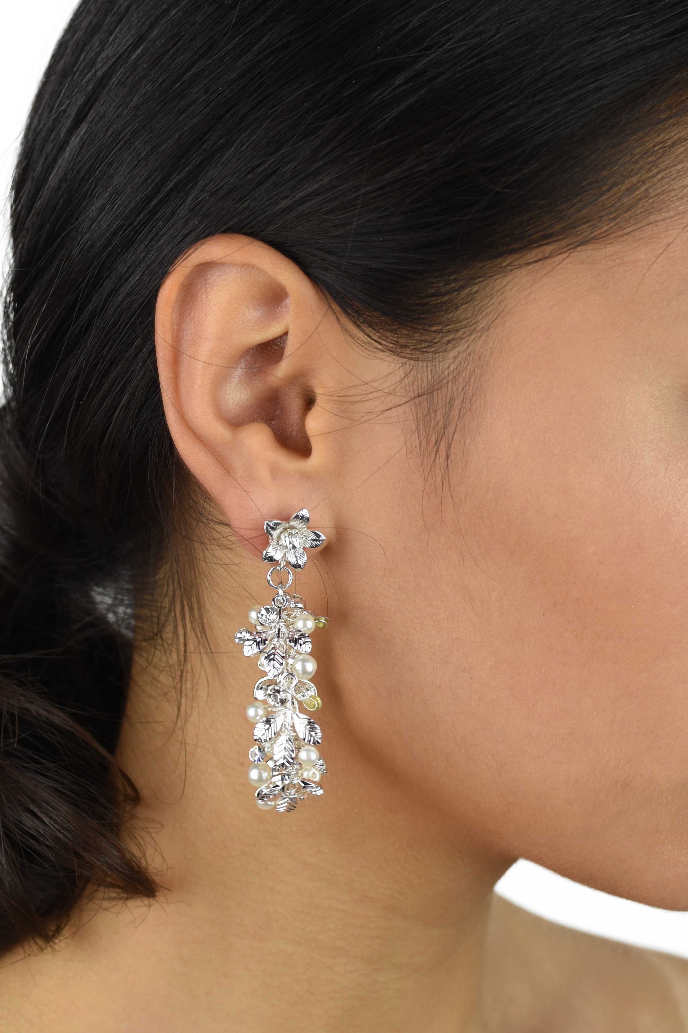 Kathleen is a statement earring in a hoop style hand made of tiny leaves and imitation pearls. This is the sister earring to our Katherine Earring in Silver.