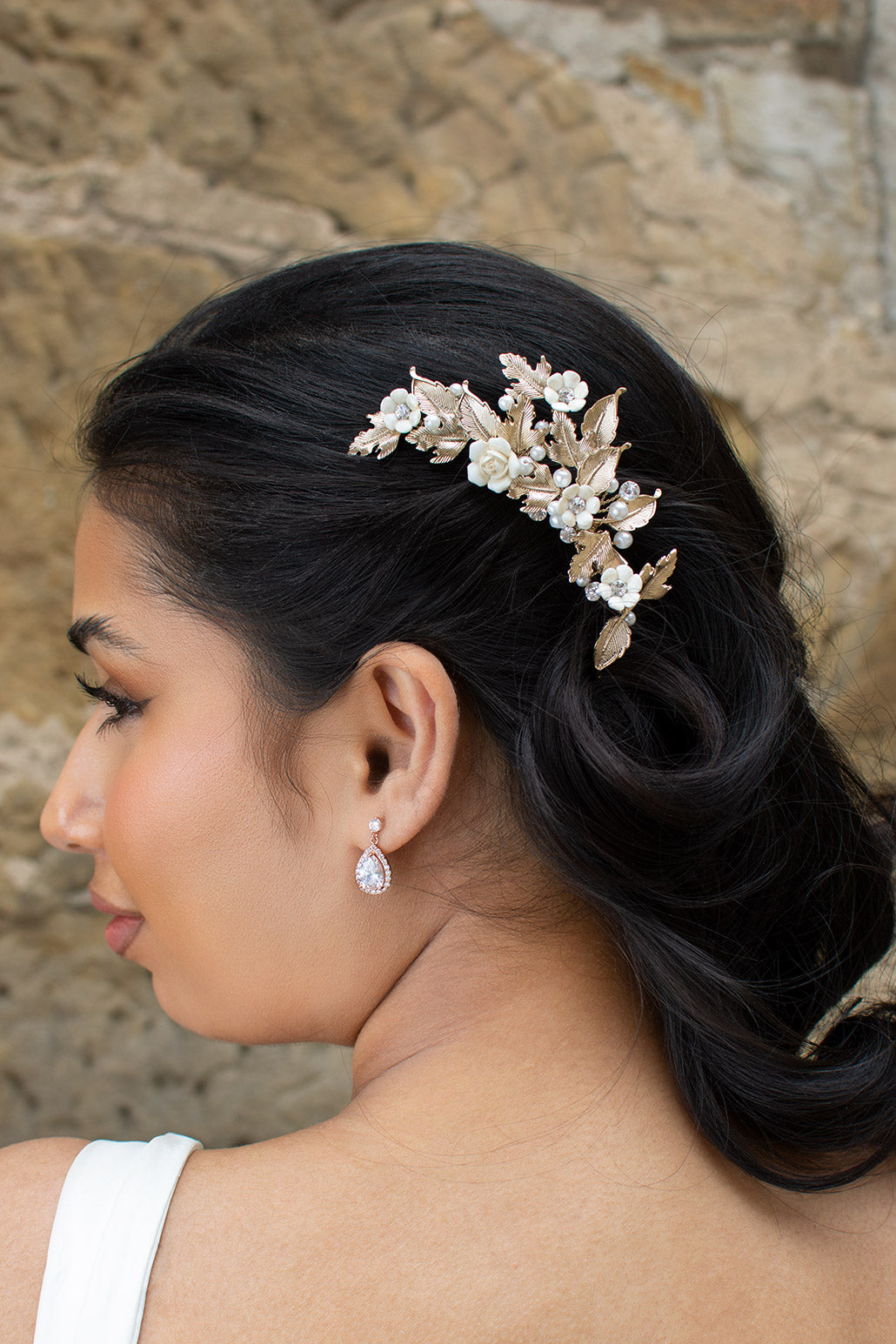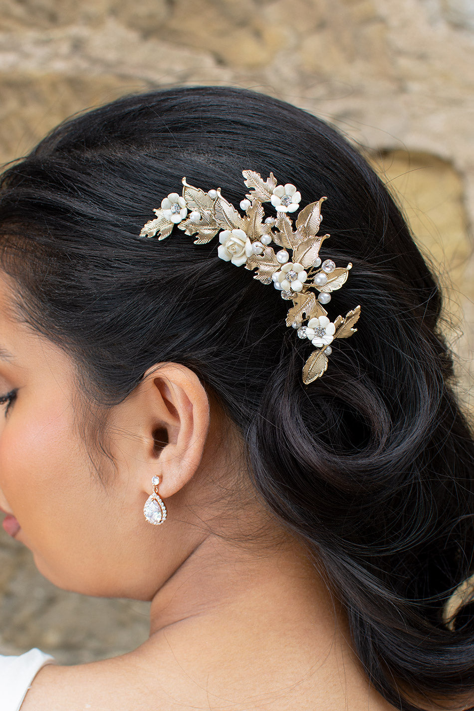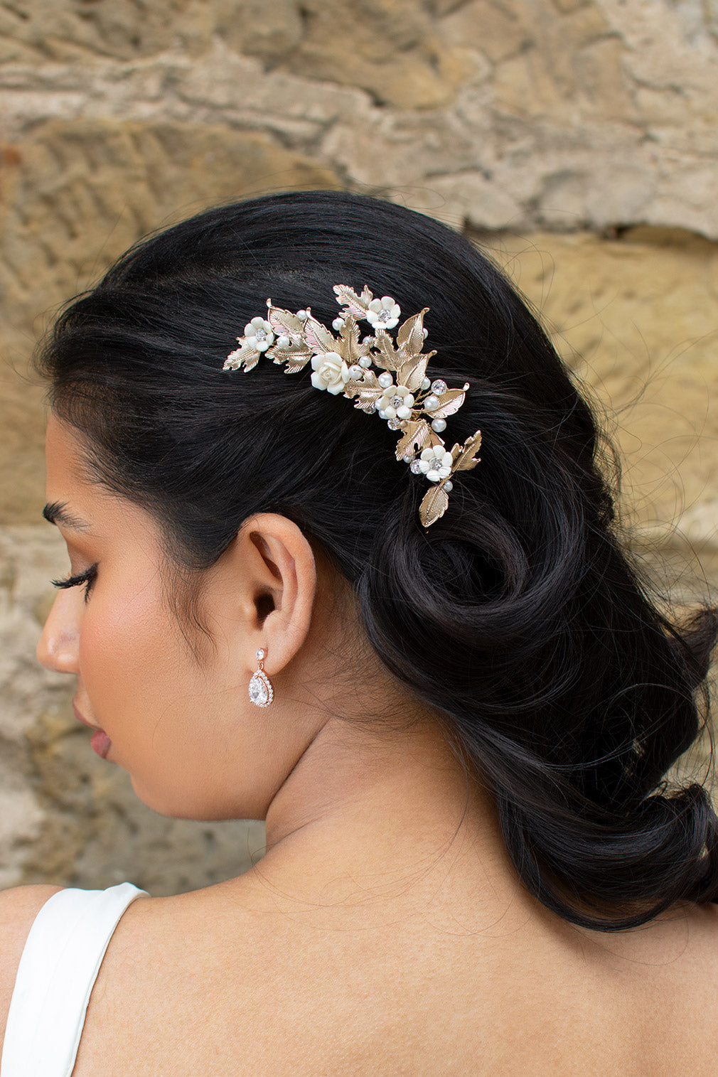 A dainty sidepiece, Piper is a beautiful and flexible arched cluster of gold plated pointed leaves and ceramic flowers. Featuring exquisite pearl and crystal embellishments, Piper is a bridal sidepiece straight out of a fairytale. Piper is fitted with a strong clip at the back for an easy and comfortable wear.
