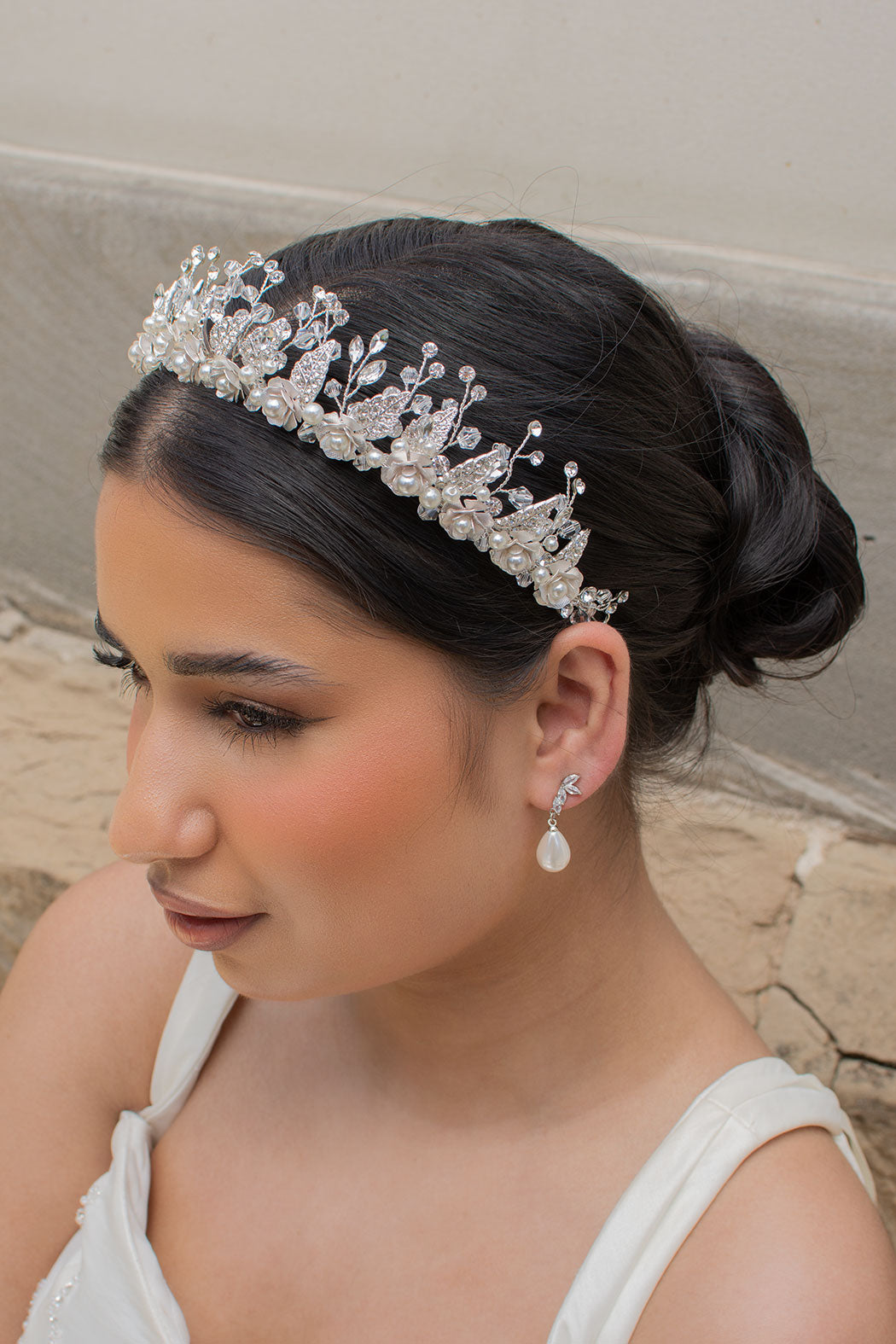 If you have been looking for a floral crown, look no further than our Seraphina design. This one is a showstopper of Cinderella proportions, featuring a striking symphony of floral elements, sparkling silver leaves and pearl and crystal embellishment. Seraphina is simply the epitome of bridal sophistication and elegance and is easily adjusted for style preference. A gorgeous Bridal Headband of fine flowers and leaves backed with sprigs of crystal and pearl, Seraphina is a lovely crown that can be worn as a low headband or raised up to be a low crown. This piece is light and flexible with no tight pressure for an easy and headache-free wear.