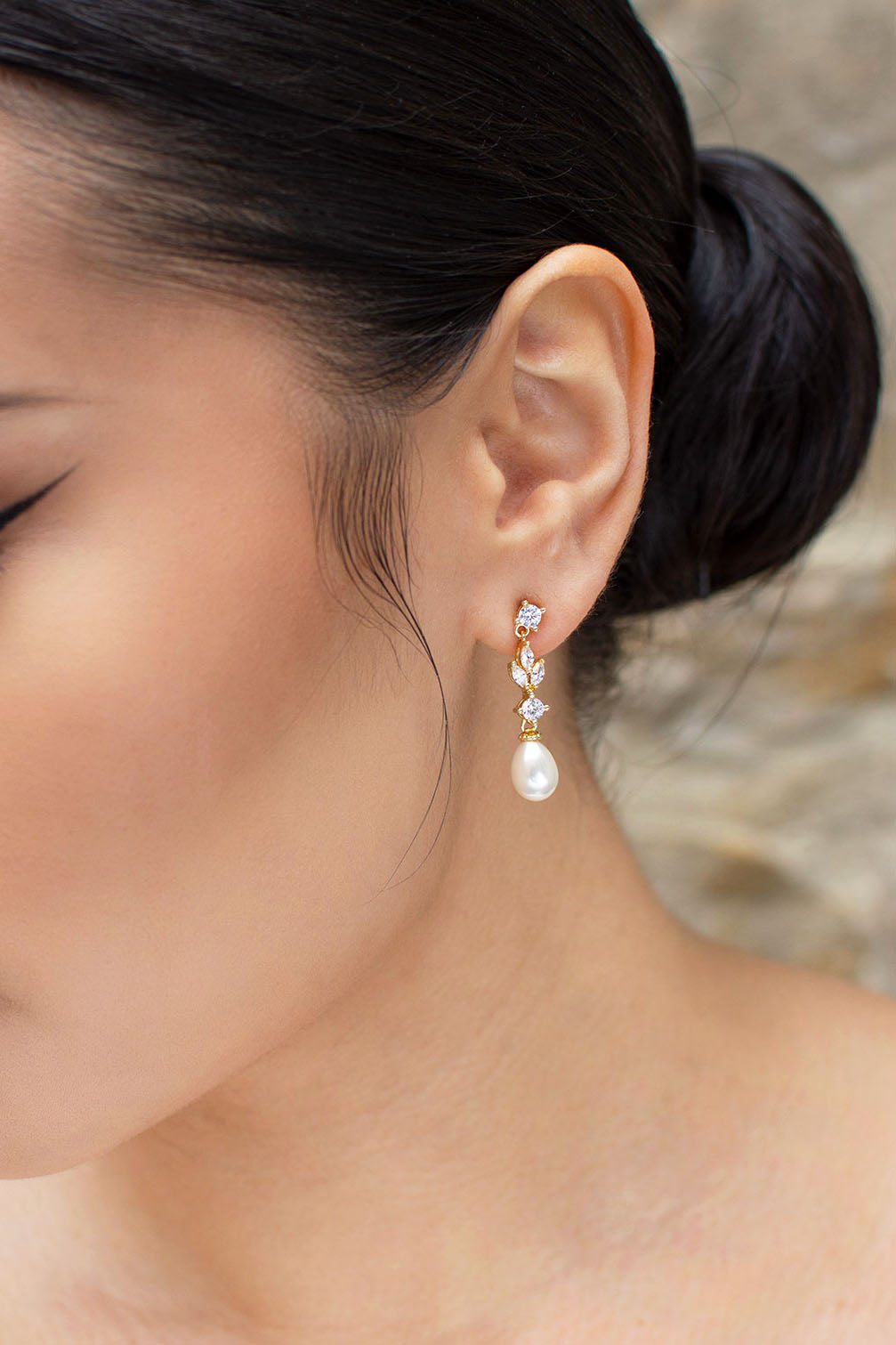 The perfect bridal earring, Tara is a stunning long drop earring made with sparkling stones and a beautifully perfect pearl drop. Tara features tiny navette crystals in the centre atop the pearl drop that both gleam and shine as you move, an earring perfect for both Brides and Bridesmaids. Delicate and detailed, Tara will dress your bridal ensemble with divinity and elegance.