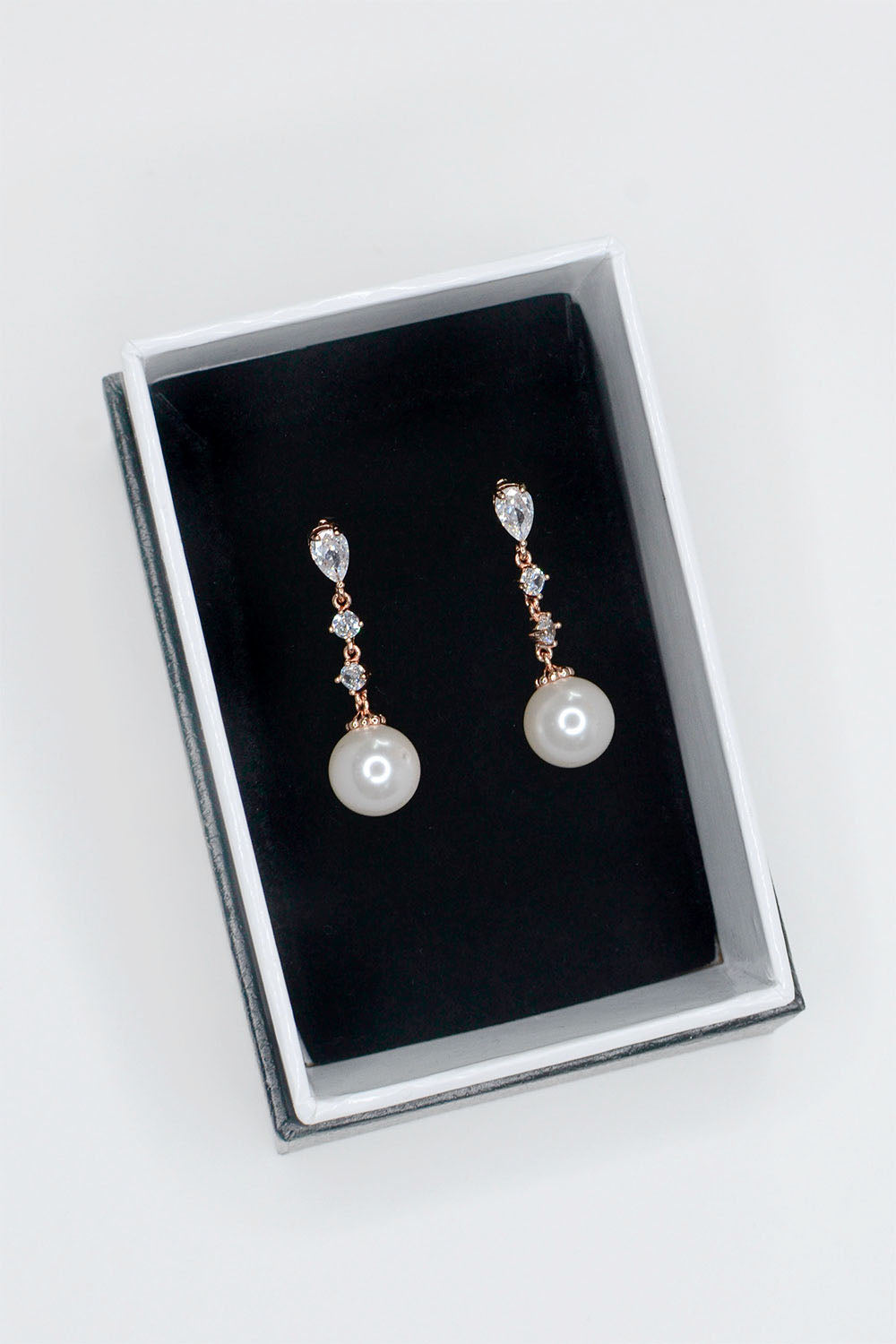 Brielle is a stunning long drop style earring. Circular stones fall from a teardrop crystal, featuring the length of the earring finished with a single beautiful pearl. Brielle is also available in Pale Gold and Silver.