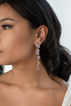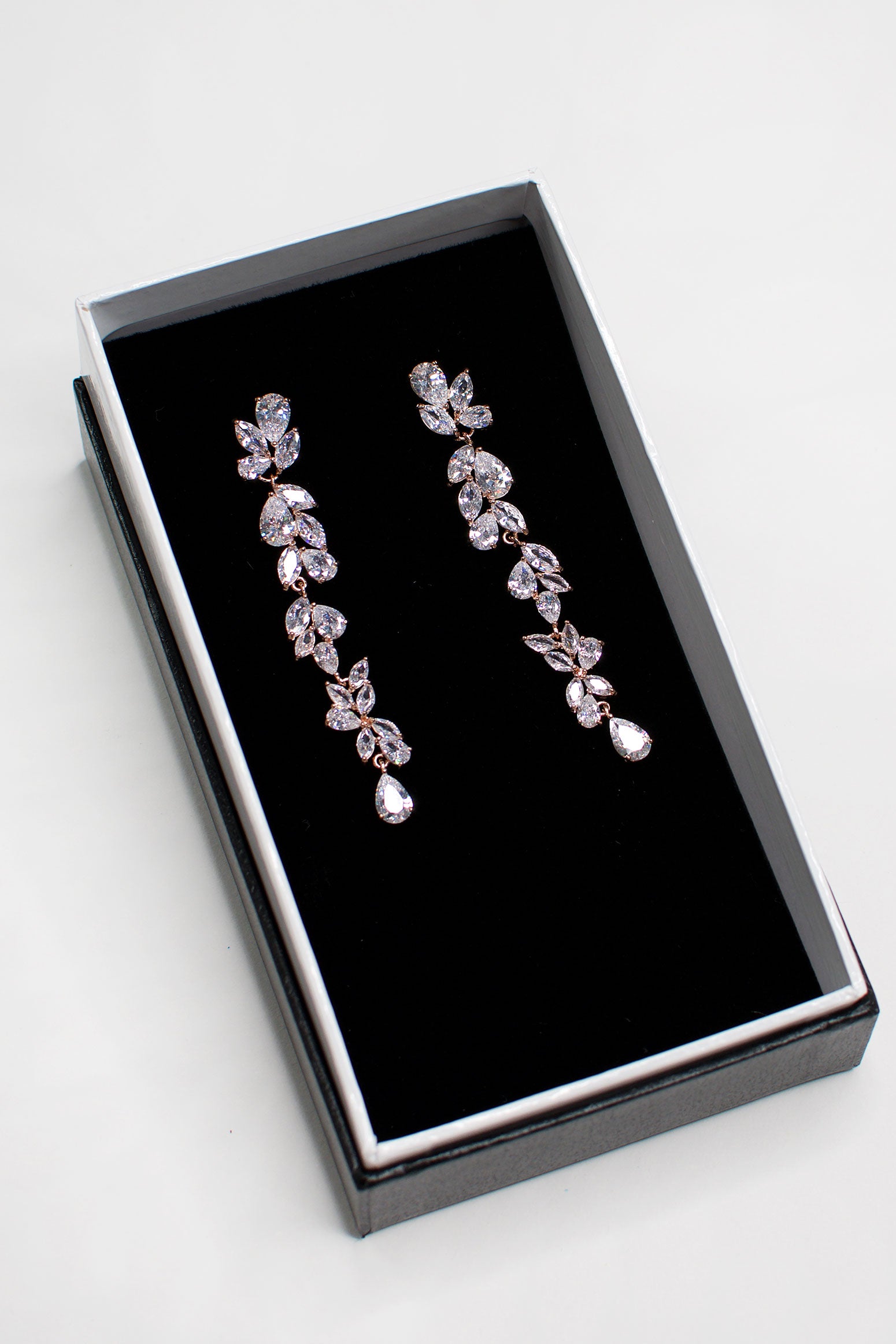 The double-size version of the Claire earring, Claudia is a stunning long-drop statement earring. Claudia will turn heads as the beautiful imitation diamonds capture and dazzle with light and its elegant extended length and pale rose gold finish. Claudia is approximately 8cm in length, 1cm in width and is 16 grams in weight. Claudia is a lovely superior quality piece featuring pear shape and navette shape stones.