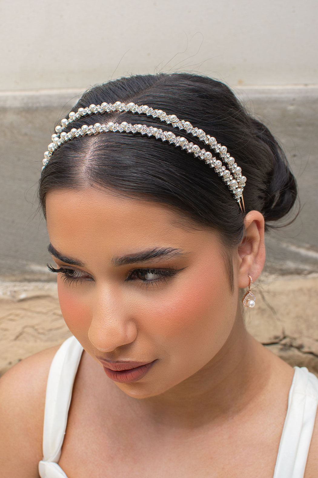 Genevieve is a classic, beautiful two-row bridal headband. The twin rows of clear crystals and pearls are bound onto the light and bendable frame, allowing this piece to mould to the shape of your head for a comfortable fit. Genevieve is modern yet glamorous and will brighten any bridal look with its' simple and pure elegance.