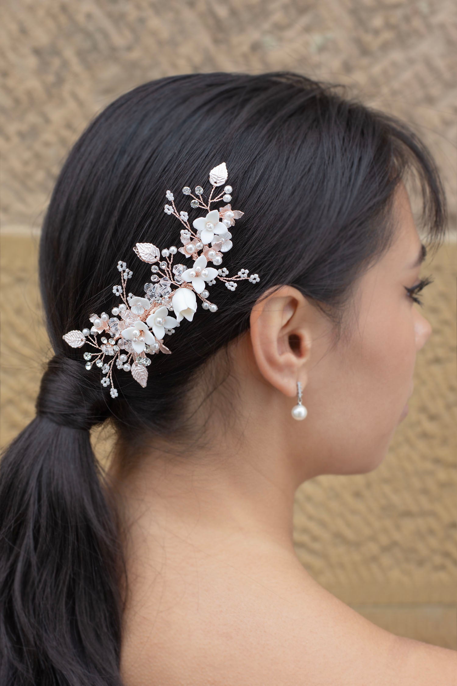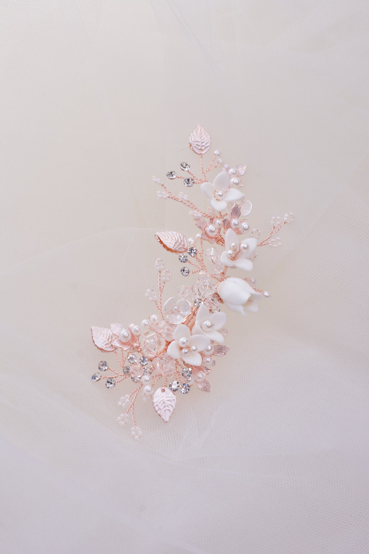 Put your best bridal foot forward with the Harlow Clip, a most delicate porcelain wonder. With all the intricacies of a growing vine and the softness of a petal, let Harlow grow along the back of the head. With feather-like qualities, Harlow gently weaves itself with elegance and glamour. Fitted with a strong clip at the back, Harlow is easy to rest over the top of a veil and wear all night long. Let Harlow shine with you on your special day.