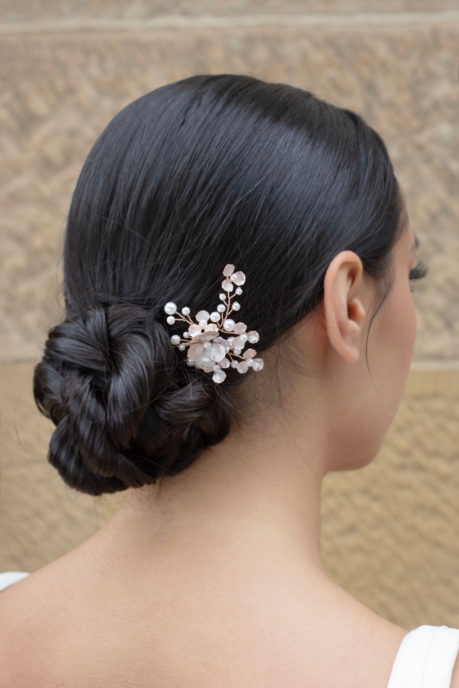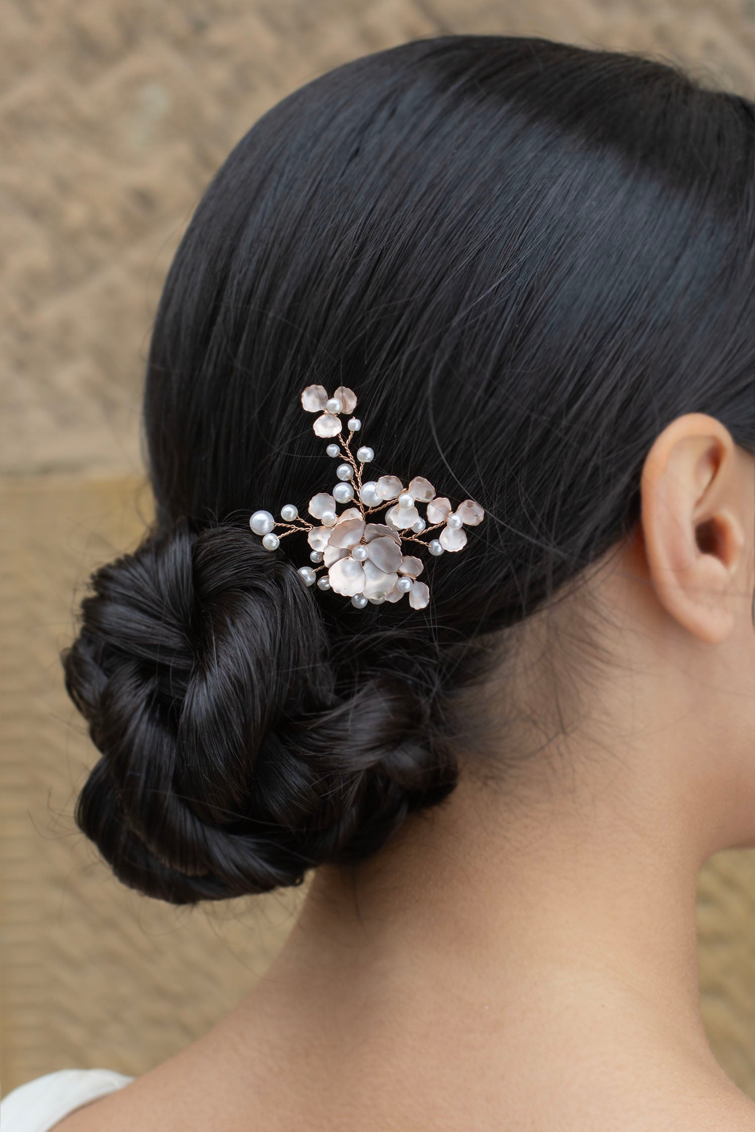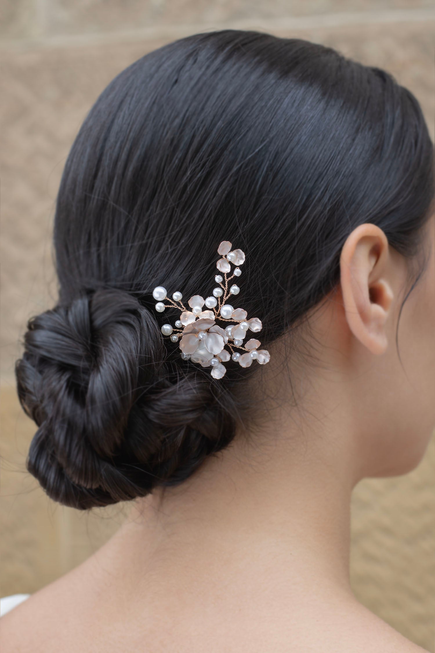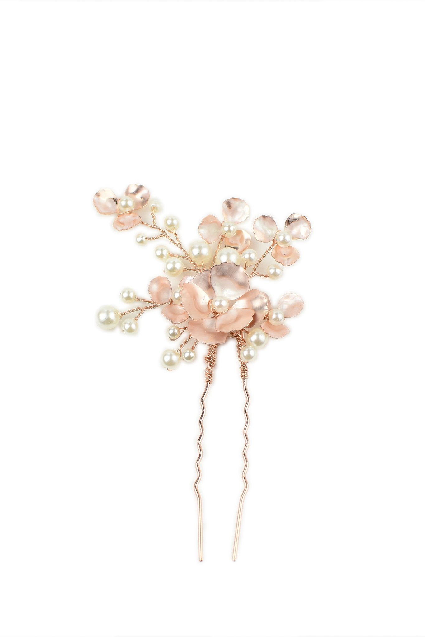 A beautiful hairpin with a fine flower overlaid with a white effect. Pearls and sprigs of pearls surround the flower, an ideal choice for Bridesmaids or Flower girls. In all three shades Bright Silver, Pale Gold and Pale Rose Gold. A matching hair pin to the Iris Rose Gold Side Comb.
