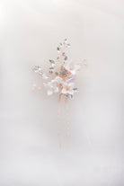 A delicate hairpin made for our minimal brides. Lilith is a beautiful hair pin featuring white porcelain flowers and spring of navette stone crystal. Perfect for Brides, Bridesmaids, Flower Girls and formal occasions.