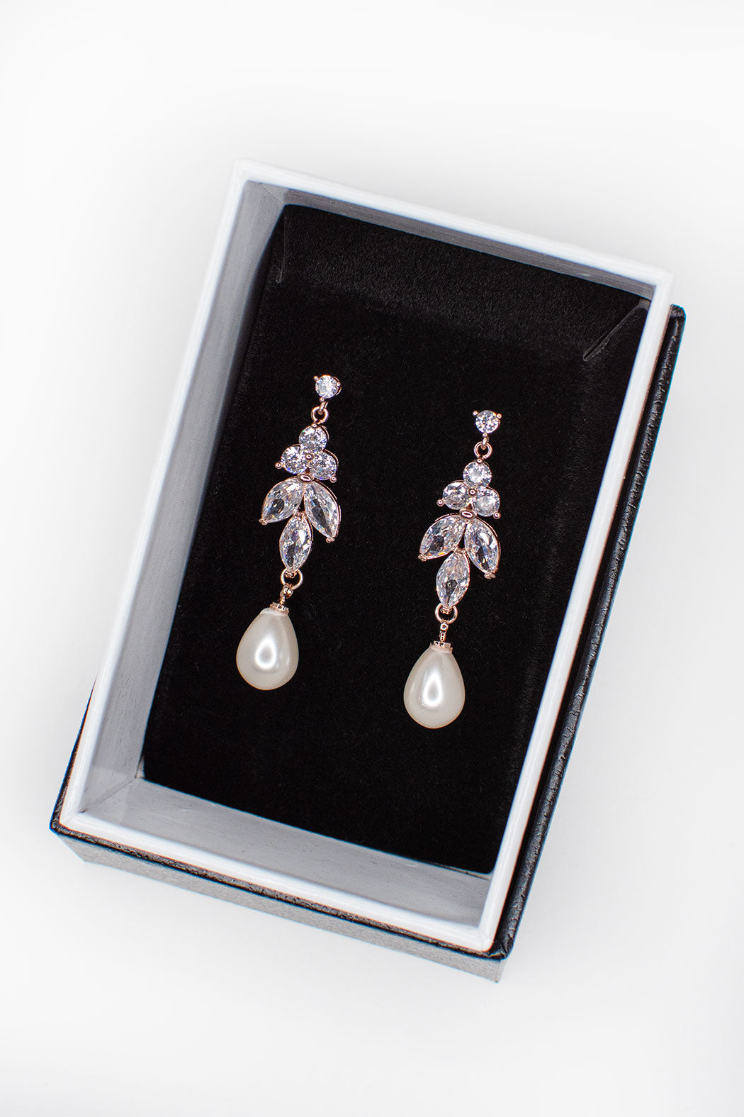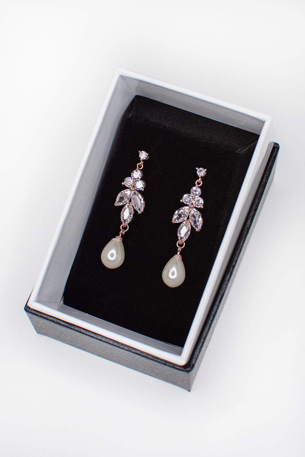A gorgeous art deco style earring, Remy features a gleaming crystal arrangement made from circular and navette-shaped crystals above a single beautiful teardrop Swarovski pearl, designed to move and dance with as much grace as the bride who wears it. A showstopper of an earring, Remy is the perfect compliment for any bridal or formal ensemble.
