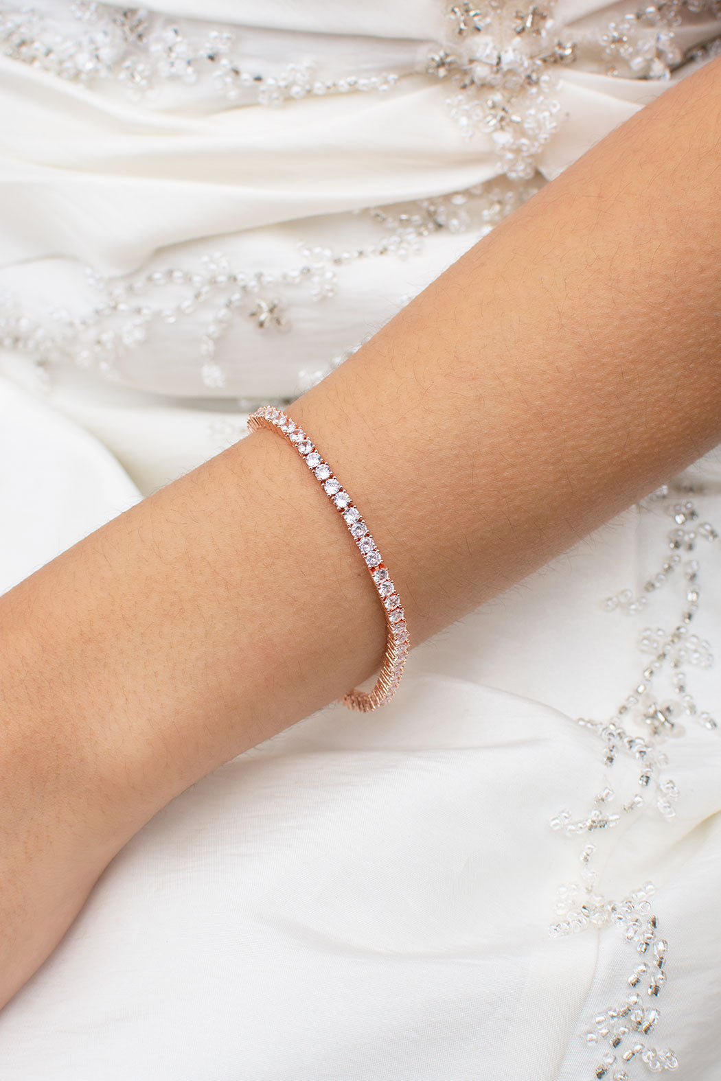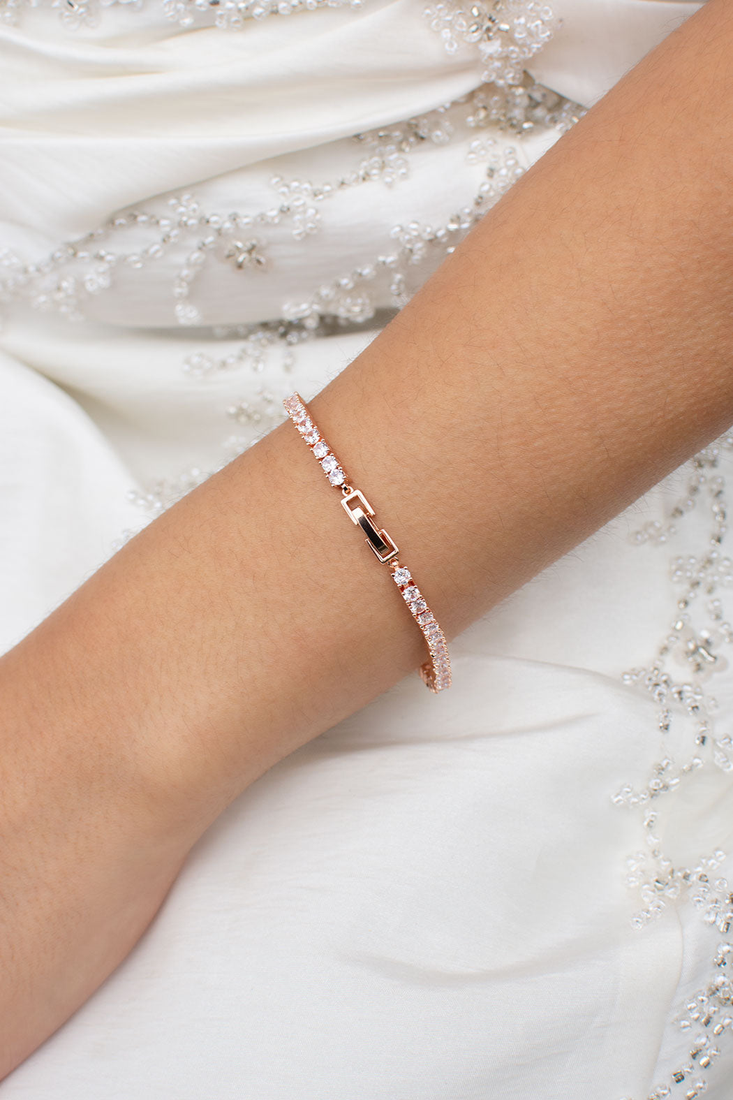 Beautiful and delicate, Valentina is a fine thin zirconia stone bracelet with a gleaming, high quality Rose Gold finish. A classic and trendy bracelet, Valentina will compliment all styles and looks, perfect for both weddings and formals alike.