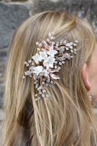 With a stunning floral design, Vivian is a show stopper of a side comb. Vivian features a gorgeous centrepiece cluster of white ceramic flowers against a symphony of soft rose gold crystal encrusted leaves and outstretching pearl bead posies. This piece fastens with a clip attached at the back for an easy and secure wear all day long. If you are looking for garden-inspired beauty, Vivian is the perfect piece for your special day.