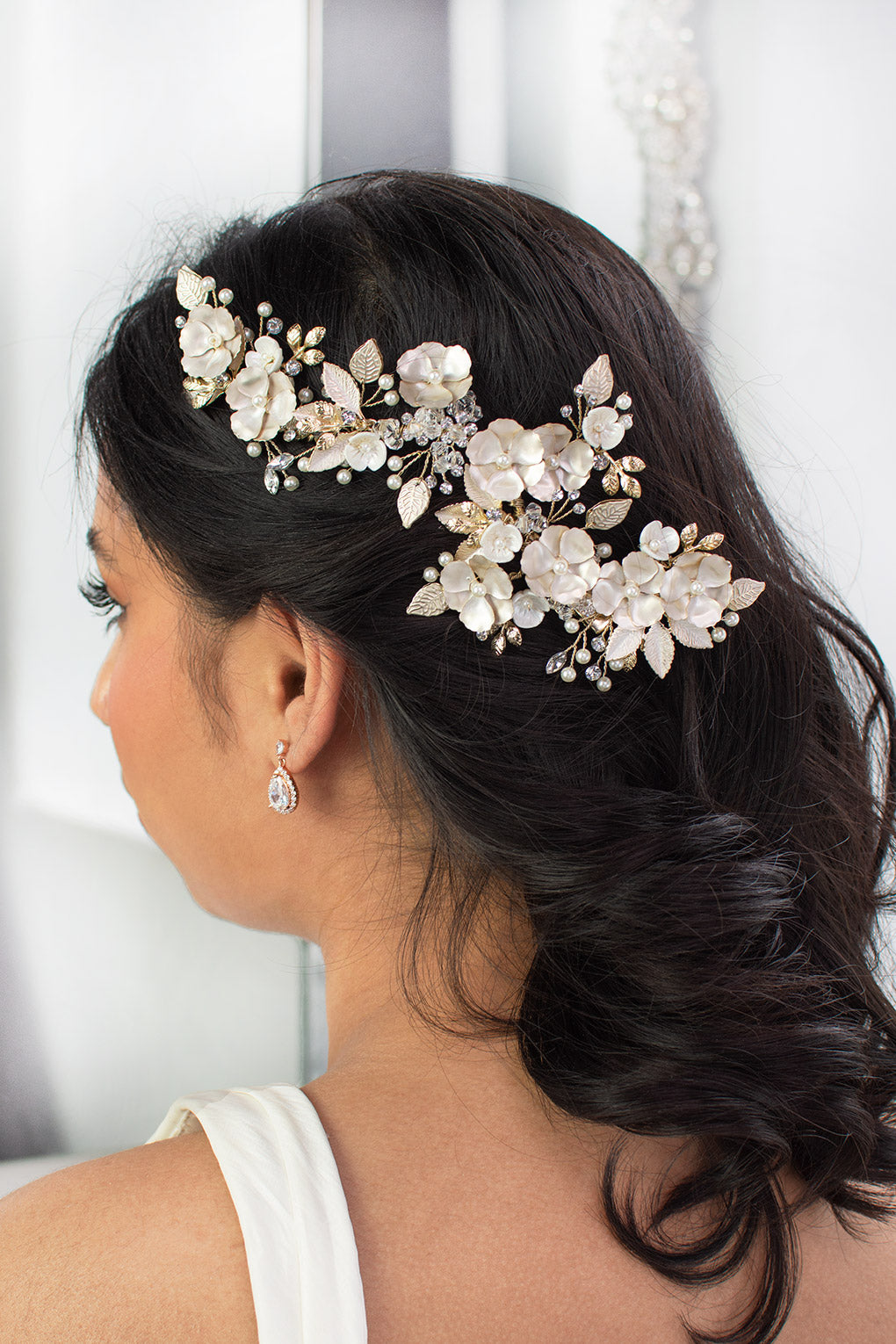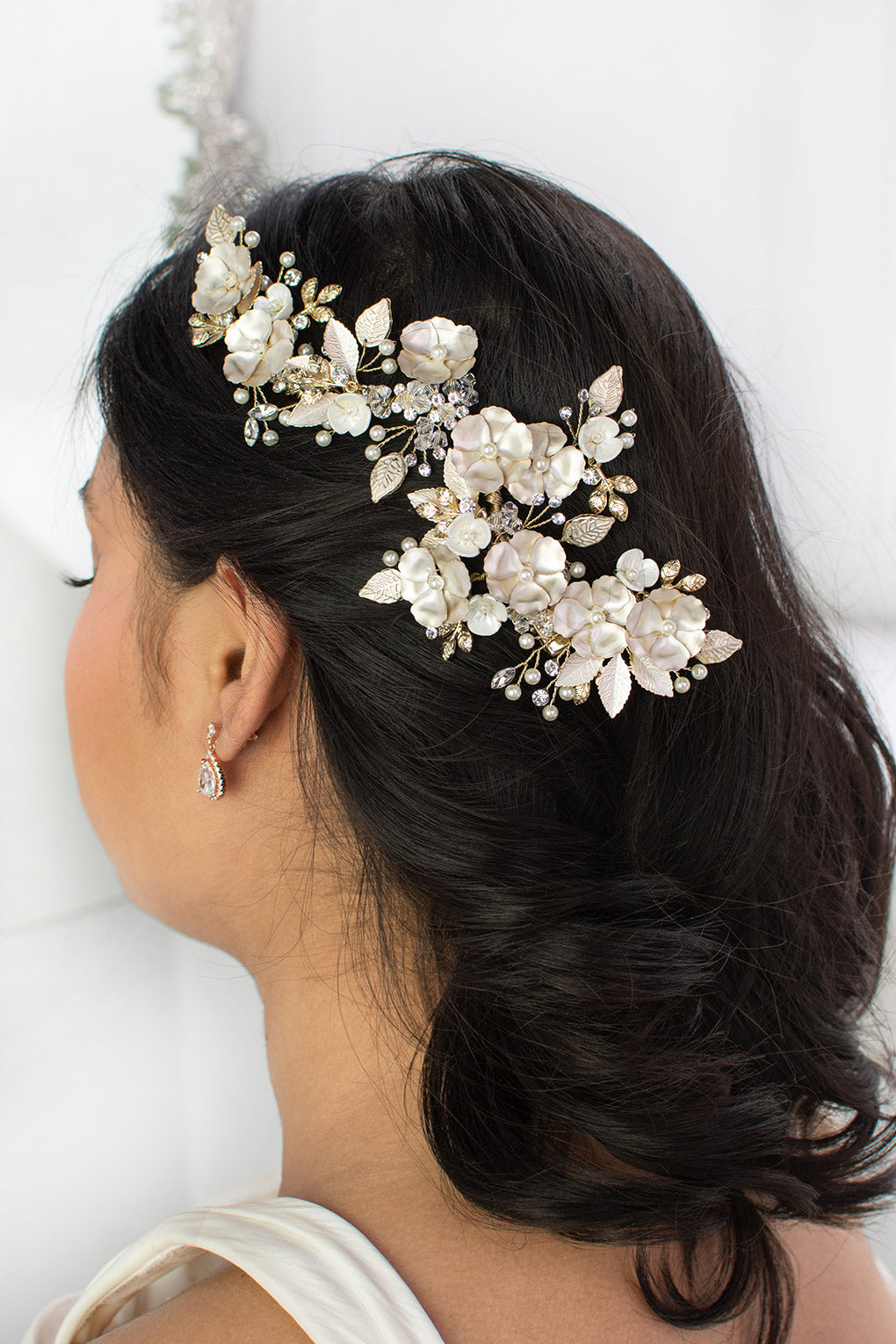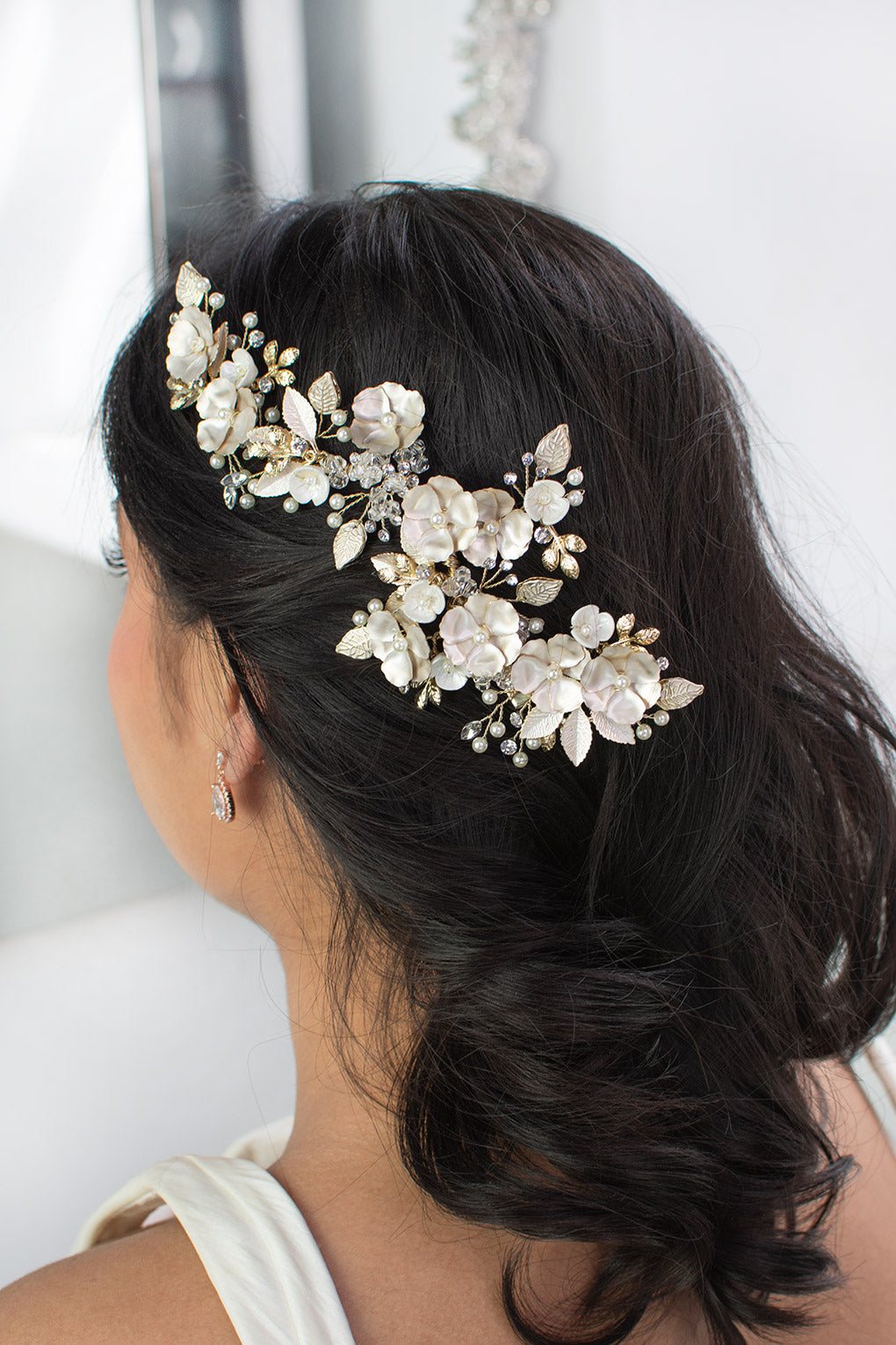 Our spectacular Siena is a radiant and soft large floral side comb that beautifully adorns the side of the head. Reminiscent of living roses, Siena is embellished with tiny pearls, crystals, small detailed leaves and flowers. Painted with a pearlescent finish the delicate flowers and leaves give a soft glow and are an amazing accessory to complete your bridal look. Siena is easily adjusted for individual style preference and is complete with clips to allow for a secure and comfortable wear.