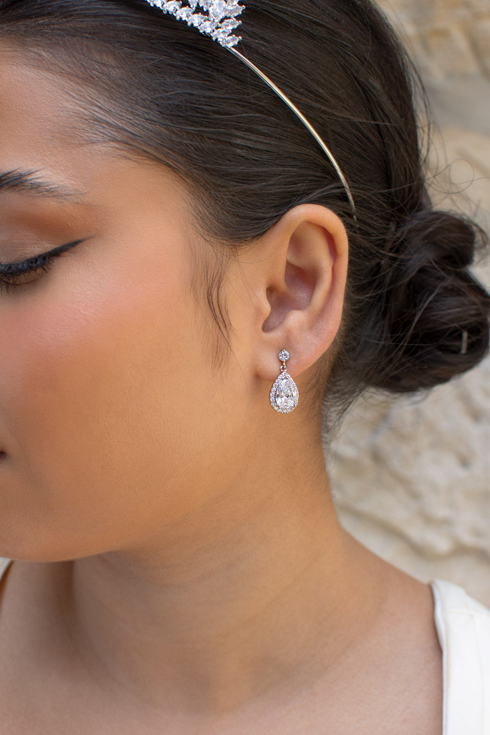 A classic earring, Diaz dazzles with the gentlest of movement as the light catches the many facets of the beautiful cubic zirconia teardrop. With an open back, the crystal rests in a silver encrusted frame positioned below a single round delicate crystal. This timeless design is versatile; suiting a wide range of bridal styles and perfectly matches a large range of our jewellery. Diaz is an earring that will be a part of your collection for years to come, accompanying you during the best moments of your life - an earring that you will cherish forever.