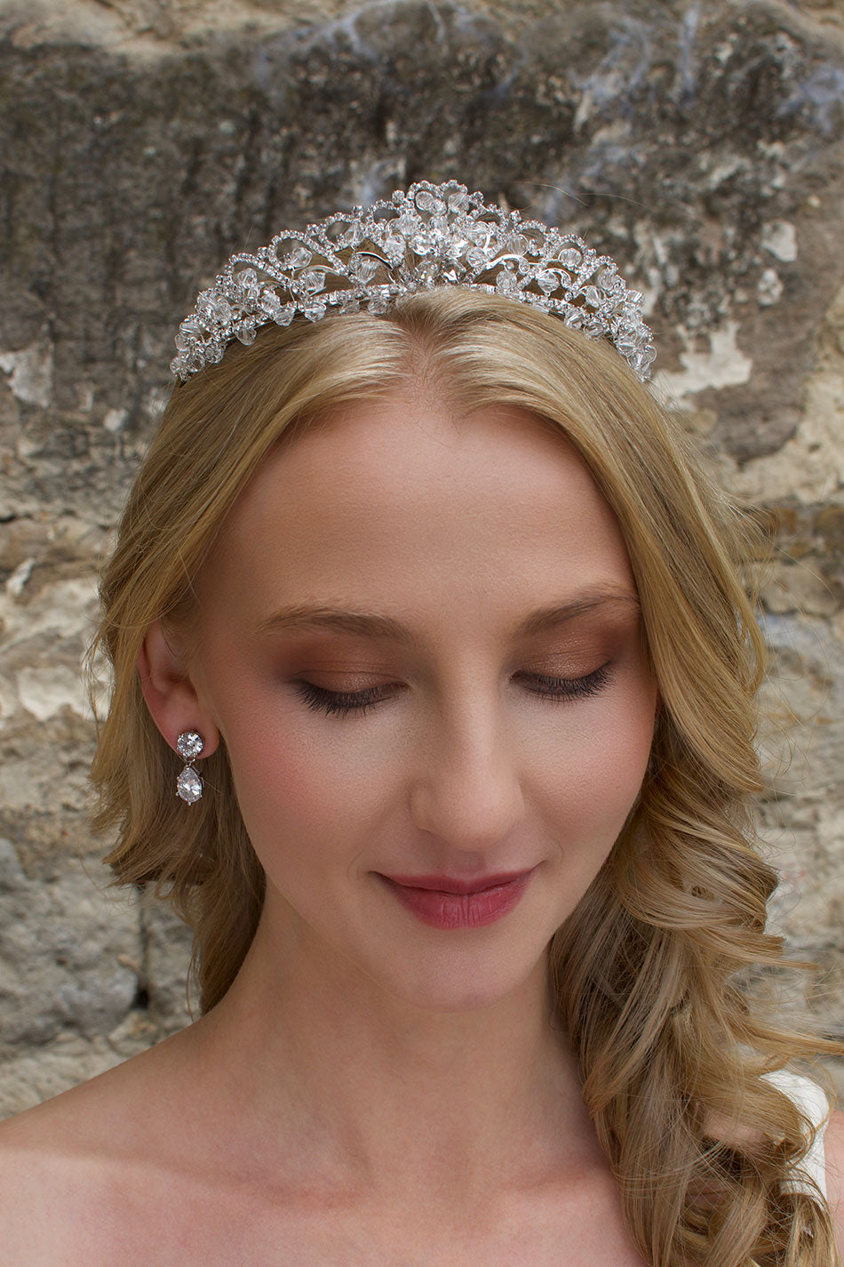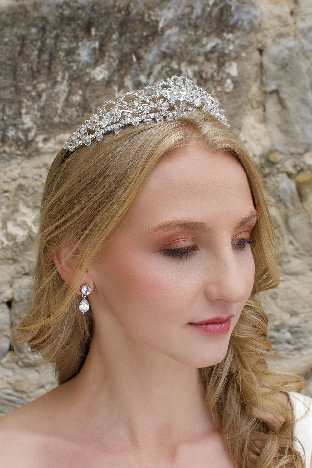 Grace is the ideal tiara for it's elegant low-rise symmetrical design. Clear crystals adorn the entirety of this crown, both attached by hand along the frame and encrusted within the metal framework. This tiara's light silver casting and beading is fit for a princess, and will make any bride feel as such. Grace is fitted with a comb at the centre of the piece to allow for an easy, comfortable and secure wear.