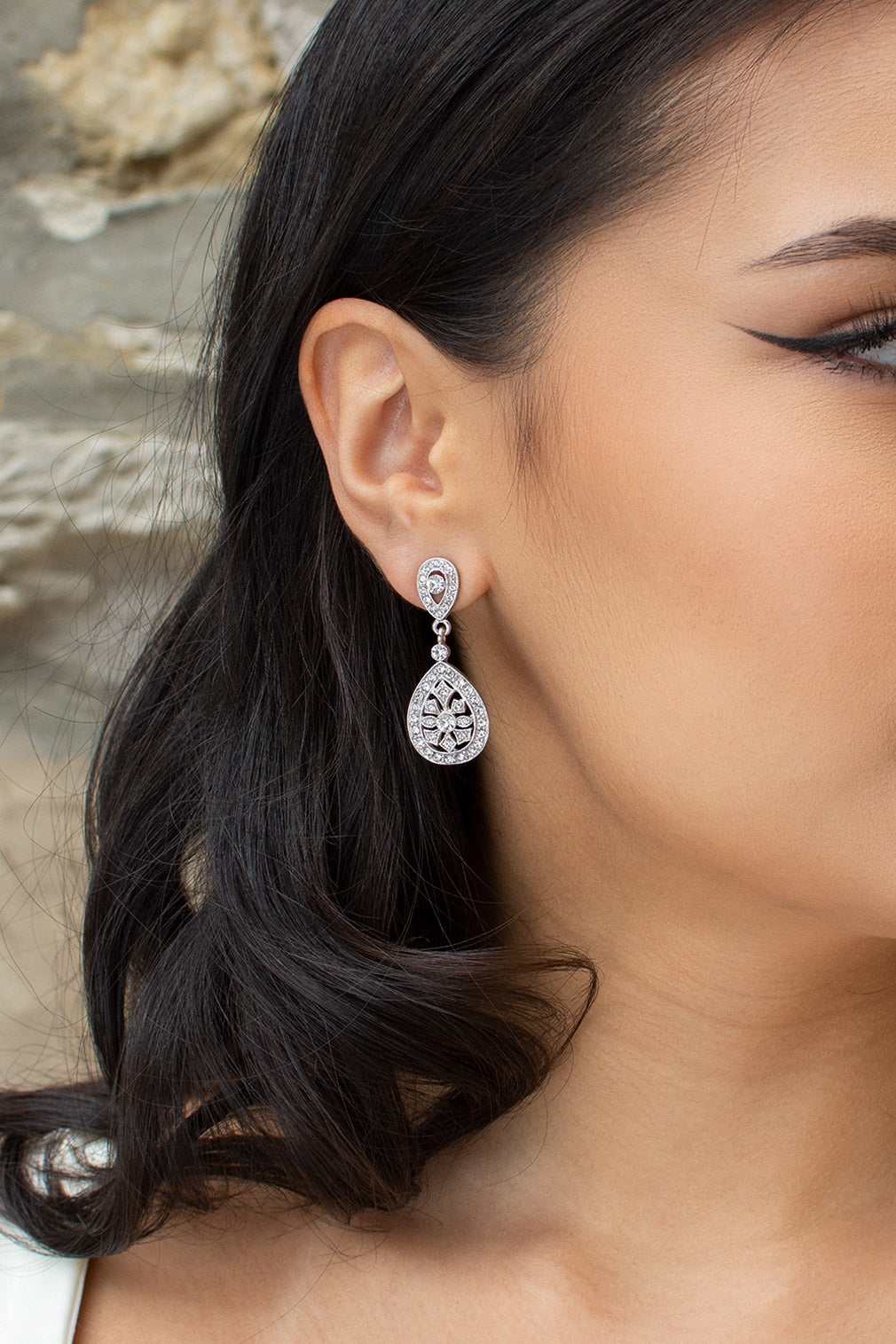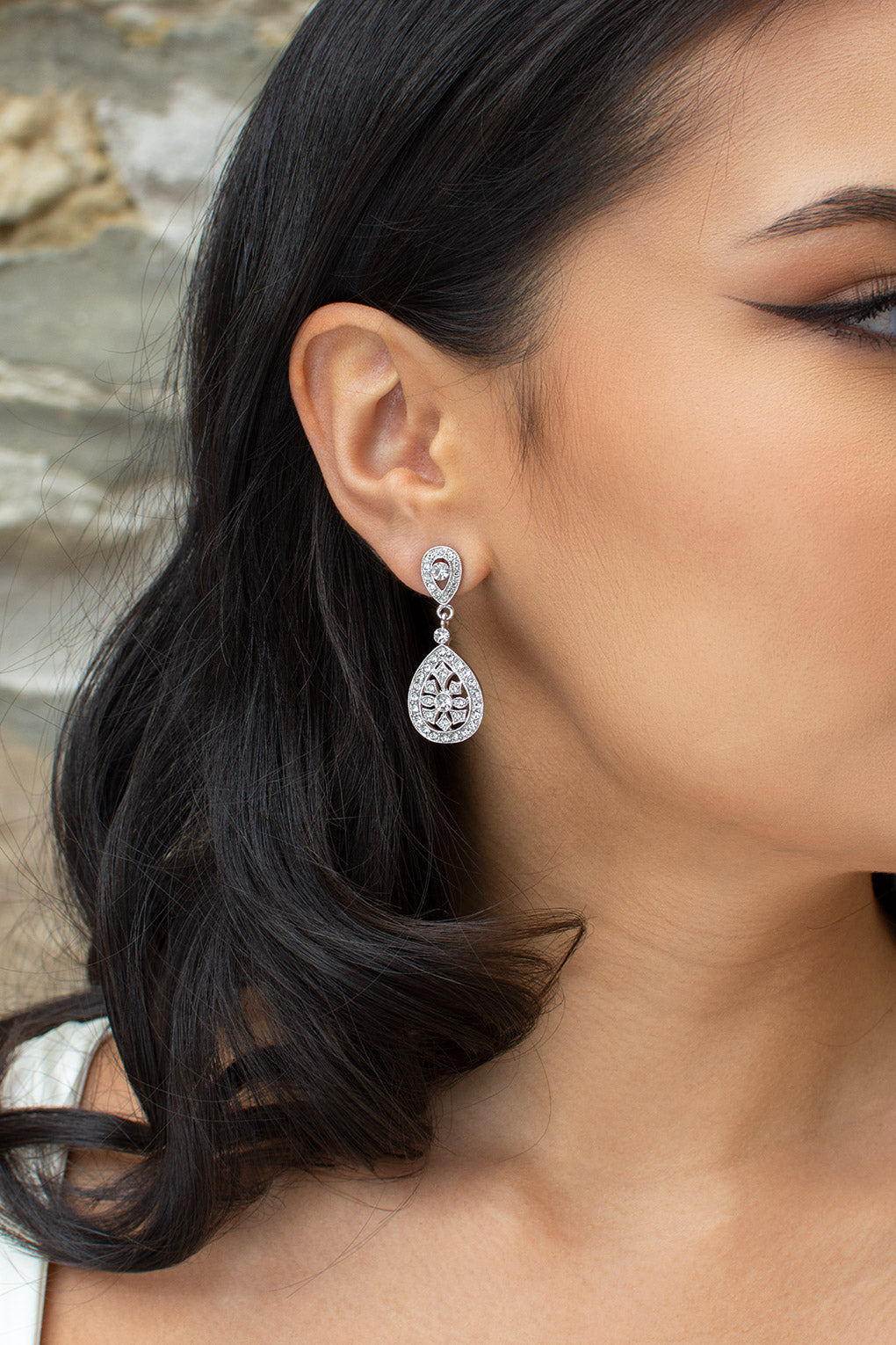 Irene is a classic Bridal earring with a rounded filigree form and just that right length that so many Brides want. Be that perfect Bride on your wedding day with the lovely Irene earring. Encrusted with the most tiny crystals the smaller top and the fuller drop in white gold finish (imitation rhodium) finish your Bridal ensemble with all the elegance of the Irene earring.
