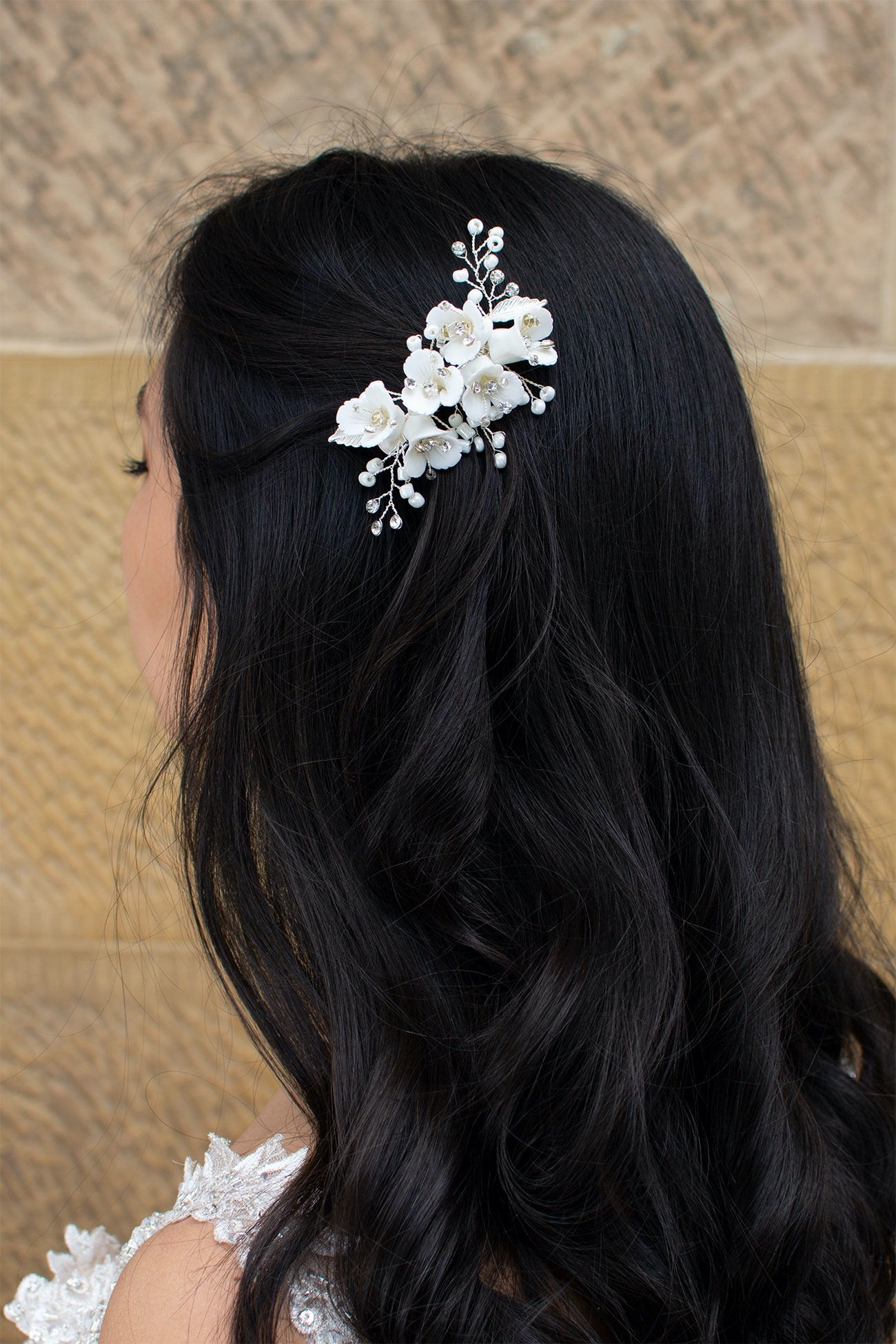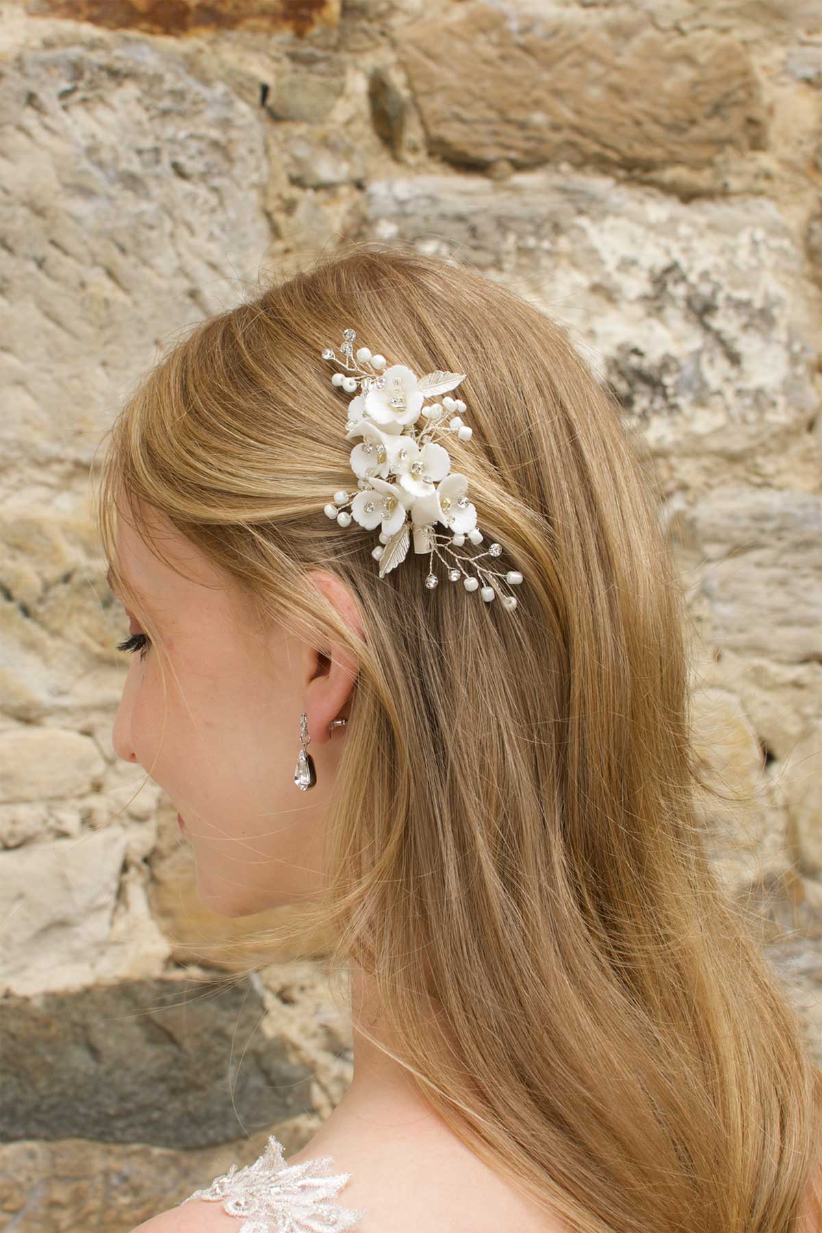 Featuring ceramic wildflowers, Karlie is a masterpiece of floral romance. The white clusters of bell-shaped bud finished with crystal centres are to die for, not to mention the delicate silver wiring and pearl beading. Lightweight and easy to fit, Karlie clip softly slides in to sit as desired. Our Karlie side comb is practically wearable romance for the wedding day of your dreams.