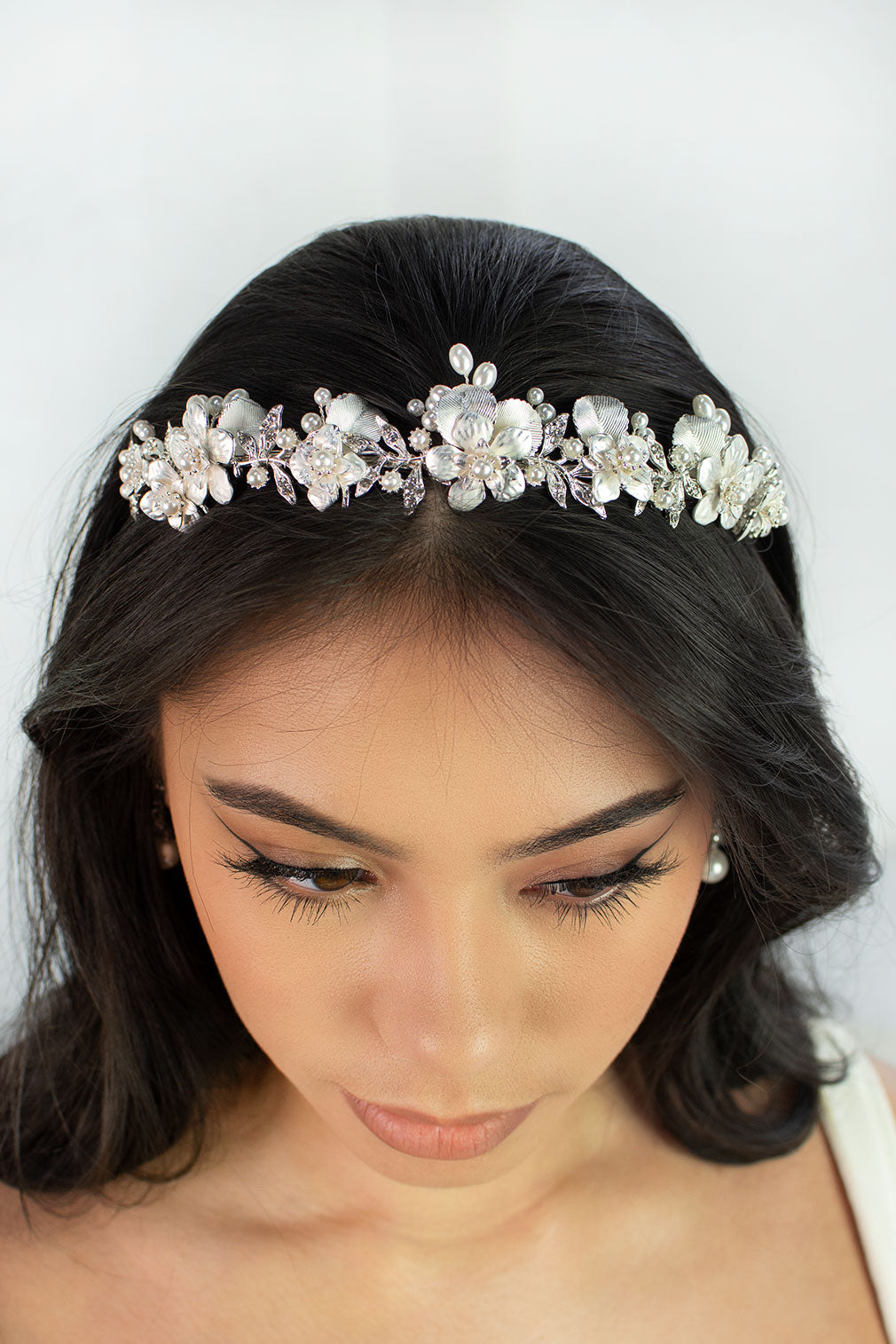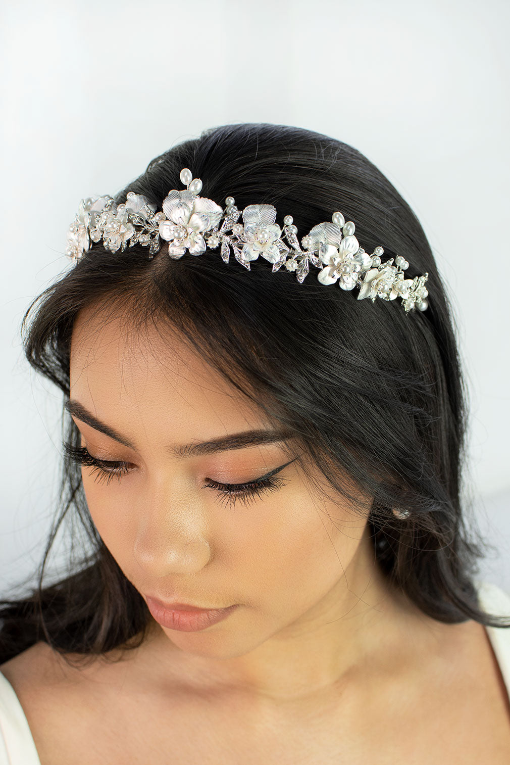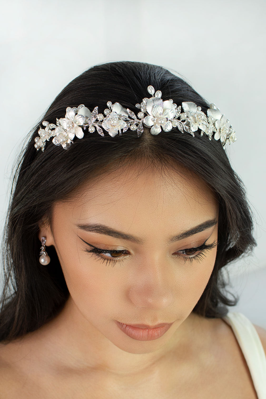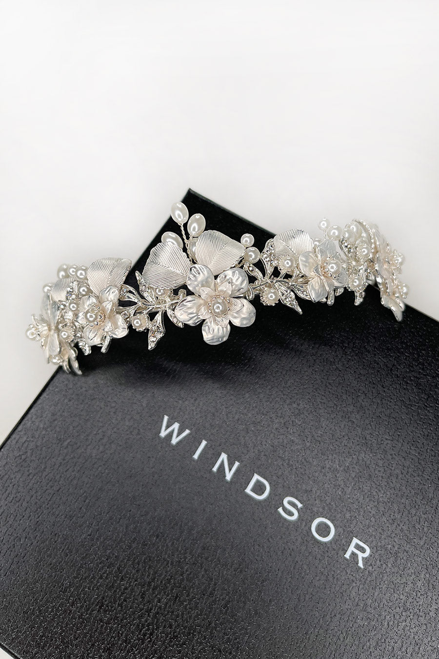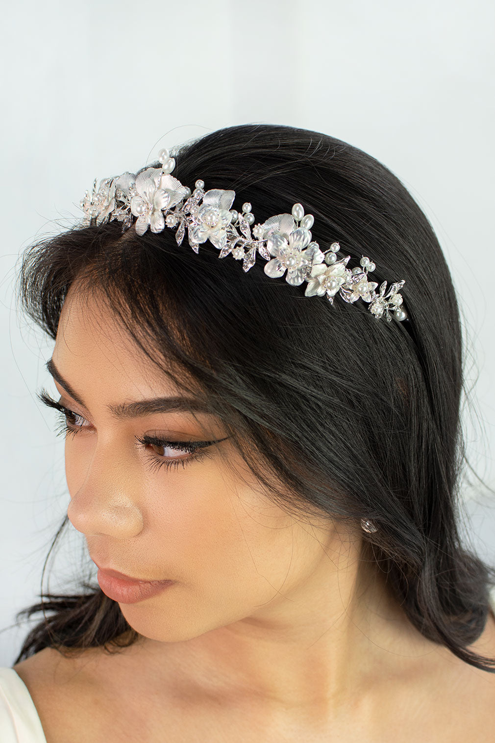 A delicate and stunning small bridal headpiece, Louise is a standout bridal tiara that is comfortable, easy to wear and simply beautiful. Louise's flower components feature a white pearlescent finish over the flower petals that give a soft and elegant gleam alongside the pearl sprigs, shining metal leaves and pearl embellishments that adorn the headpiece from side to side.