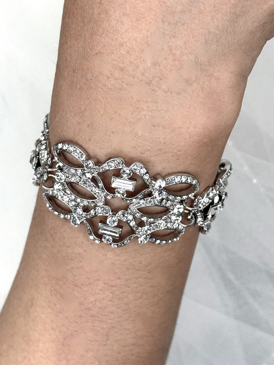 The Mackenzie Bracelet is a magnificent piece crafted with three motif parts that form a cuff around the wrist. The sections are all curved that fit around the wrist with ease and feature rectangle shaped stones called baguettes. This wide bracelet is an art deco dream featuring baroque influence and charm. Mackenzie is a wonderful addition to your Bridal look offering a representation of the bond between you and your loved one. Feel the strong connection and love that the Mackenzie Bracelet brings. This features an adjustable extension chain making it ideal for many wrist sizes.